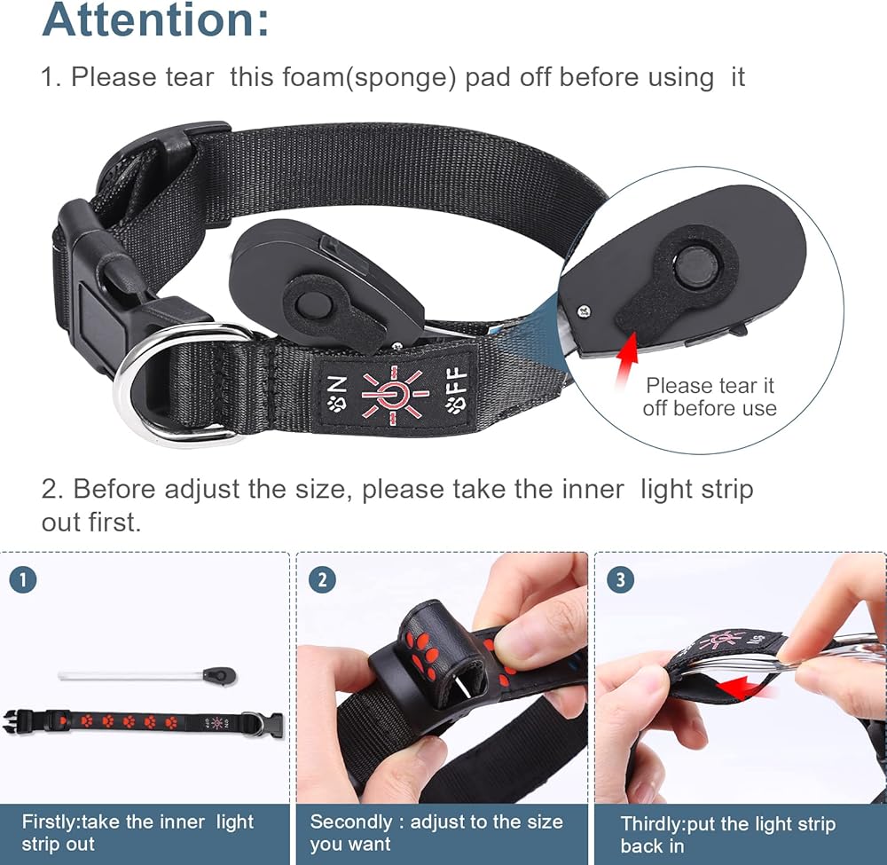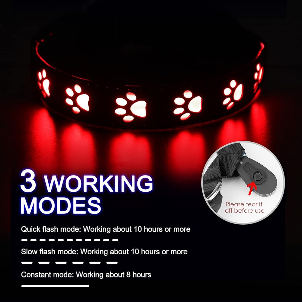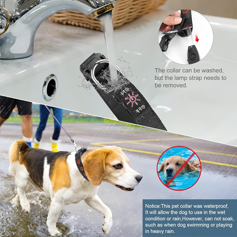 🐶 مستوى IP67 مقاوم للماء - يمكن استخدام طوق الكلاب الوامض هذا في أي وقت، حتى لو كان الجو ممطرًا، فلا داعي للقلق، ولكنه يسمح أيضًا لكلبك بالسباحة مع الطوق، ولكنه أيضًا مريح لتنظيف الطوق للحفاظ على طوق نظيف.