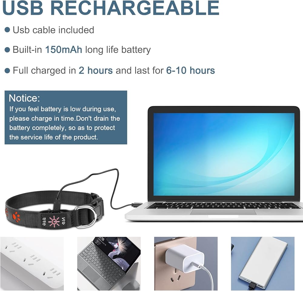 🐶 قابلة لإعادة الشحن عبر USB - هذا الطوق المتوهج LED قابل لإعادة الشحن عبر USB، وهو أكثر اقتصادًا وصديقًا للبيئة. شحن حوالي 1.5 ساعة، يمكن استخدامه بشكل مستمر لمدة 6-10 ساعات في وضع الإضاءة المستمر، تصميم LED مريح، الاستخدام لفترة طويلة لن يسخن.