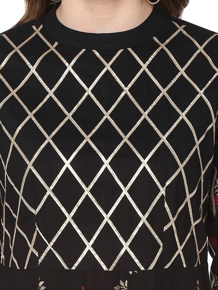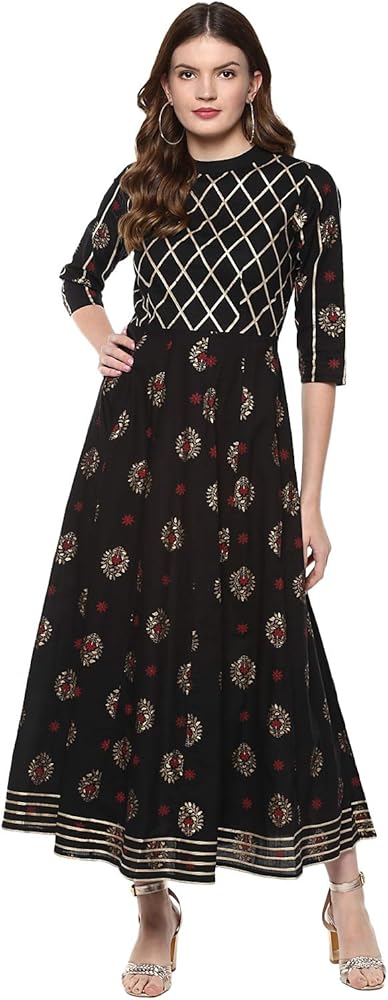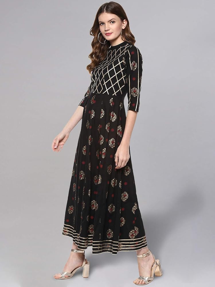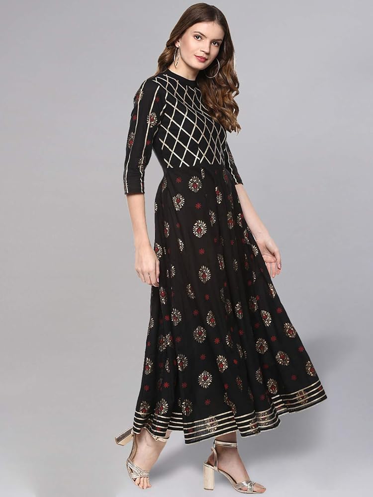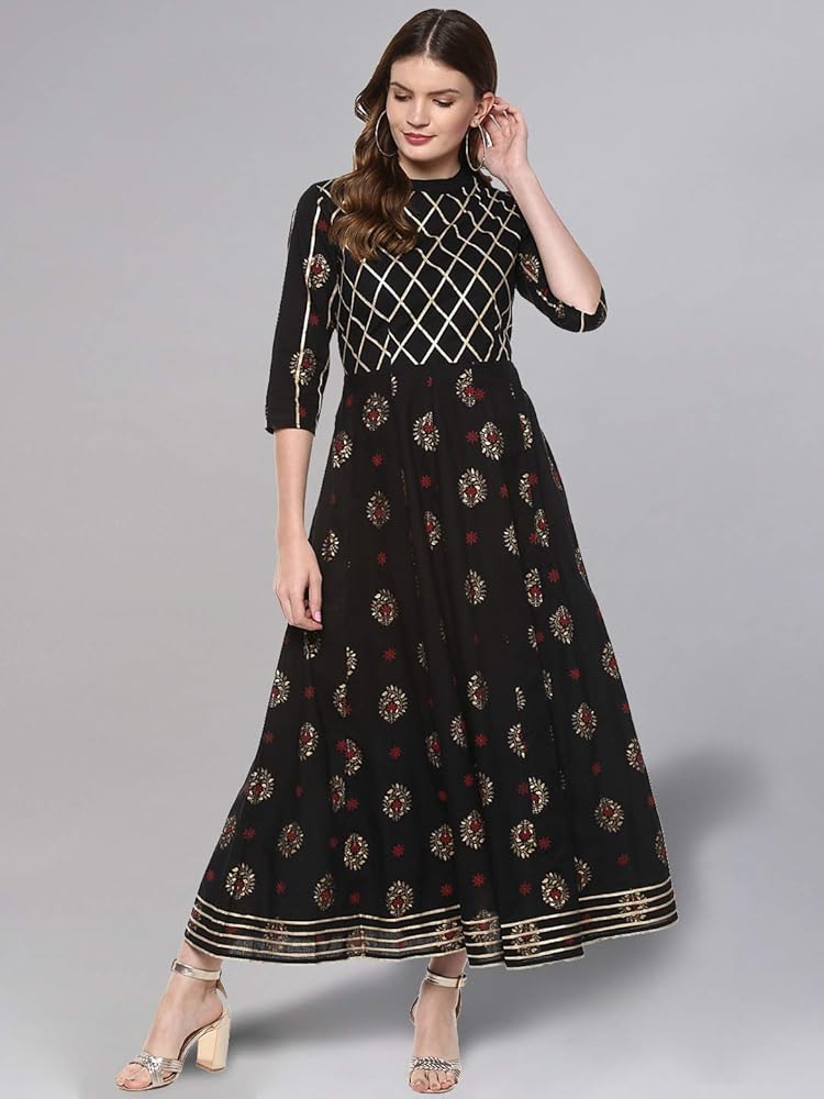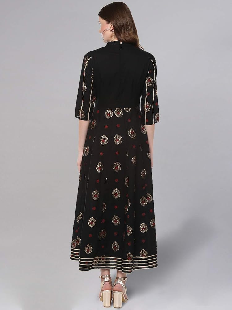 Description - gold print anarkali kurta, with closed Chinese collar, three quarter sleeves, Gota detailing, ankle length kurta, flared hem.