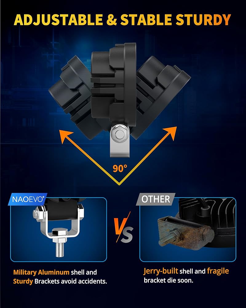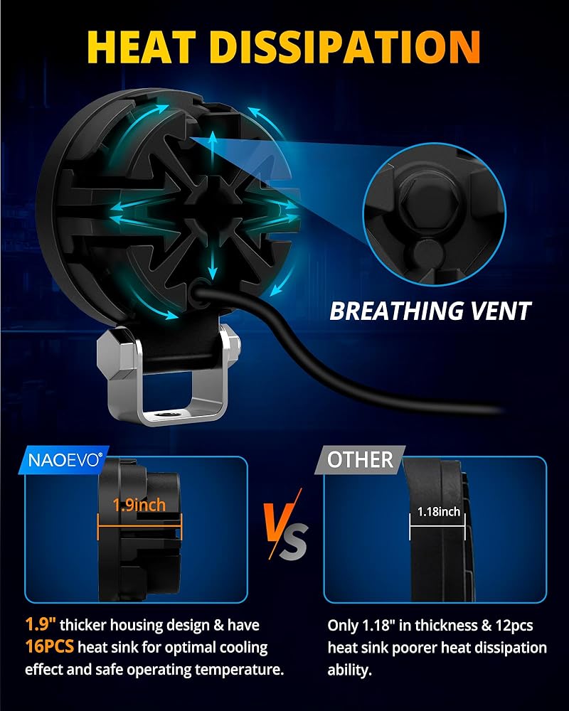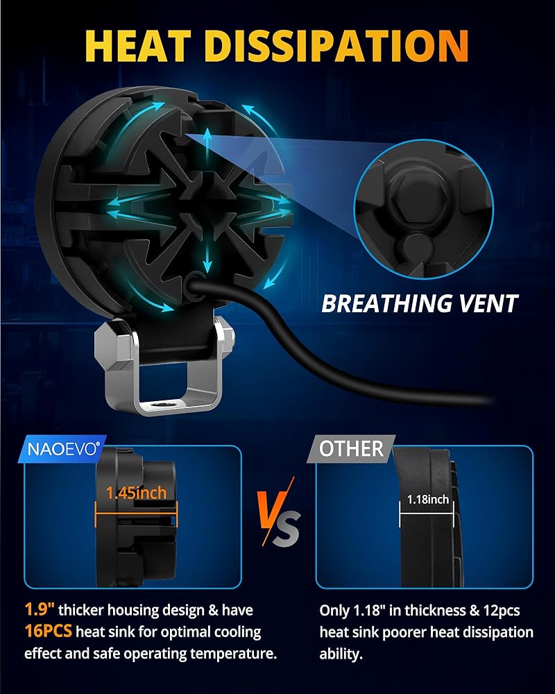 【أداء ممتاز】مصابيح LED مستديرة مصنوعة من غلاف ألومنيوم 6063، ومغطاة بشحم حراري لتبديد الحرارة بكفاءة. بالإضافة إلى ذلك، يتميز مصباح العمل LED بعدسات PC قوية وأقواس تثبيت، والتي يمكن أن تكون مقاومة للصدمات والرياح والغبار والتآكل.