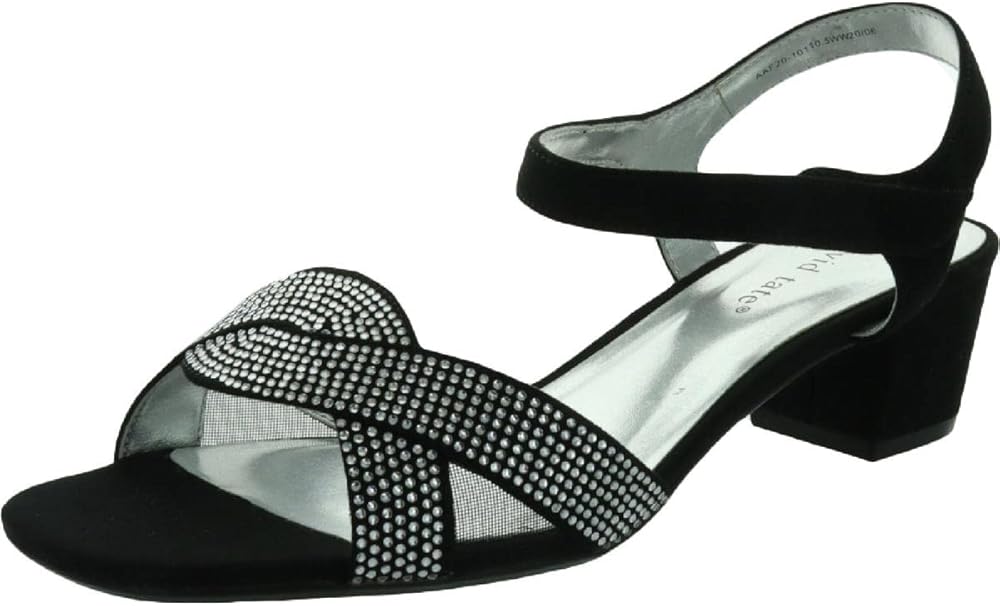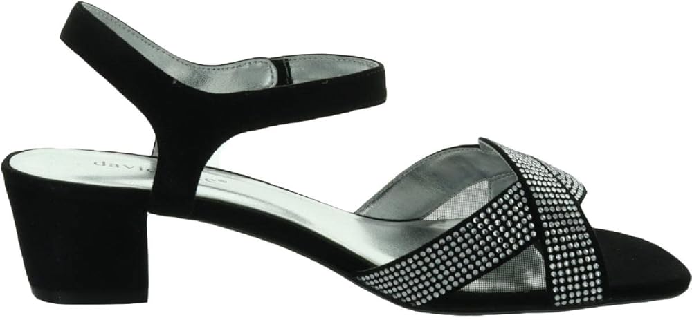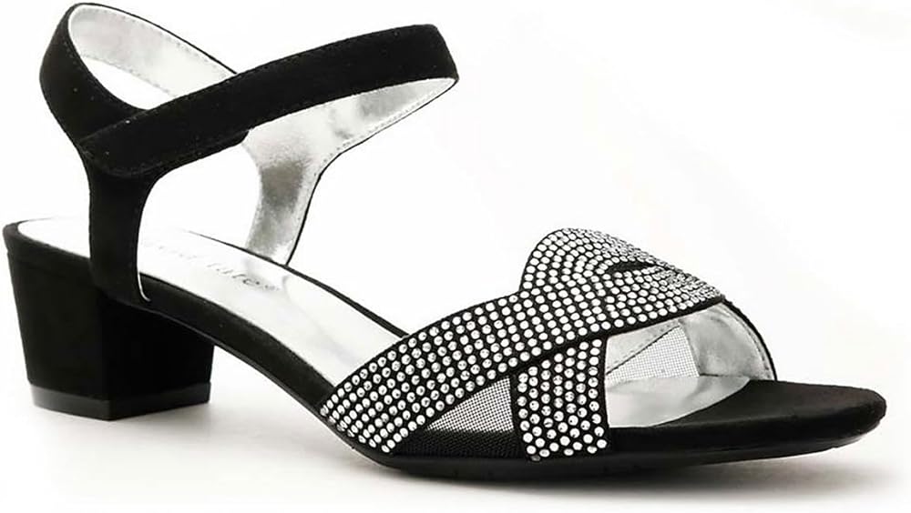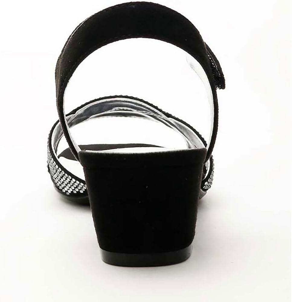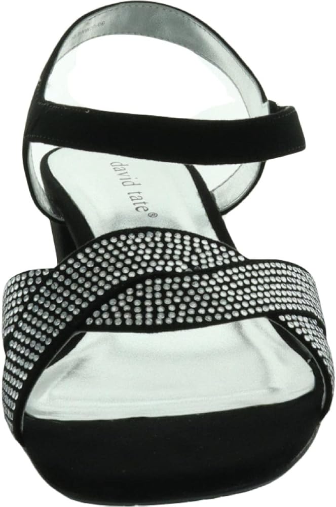 The David Tate(r) Rain features a satin upper with rhinestone accents at the straps, slip-on construction with adjustable hook-and-loop closure, and open-toe silhouette.