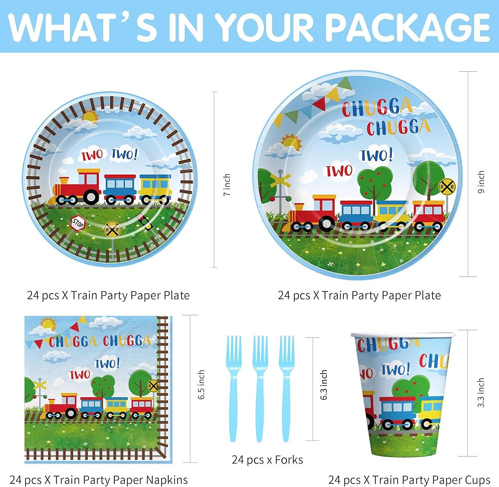 【Party Package】This train birthday party supplies dinnerware set for 2-year-old birthday can accommodate up to 24 guests and includes everything you need: 24pcs 9'' train dinner plates, 24pcs 7'' train dessert plates, 24pcs napkins, 24pcs cups, 24pcs disposable forks. Get these train 2nd birthday party tableware to elevate your celebration