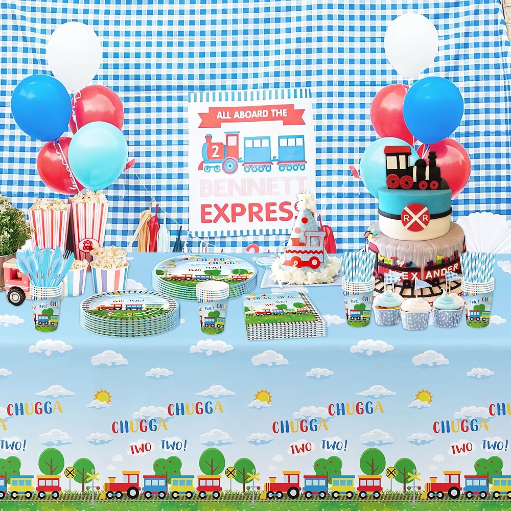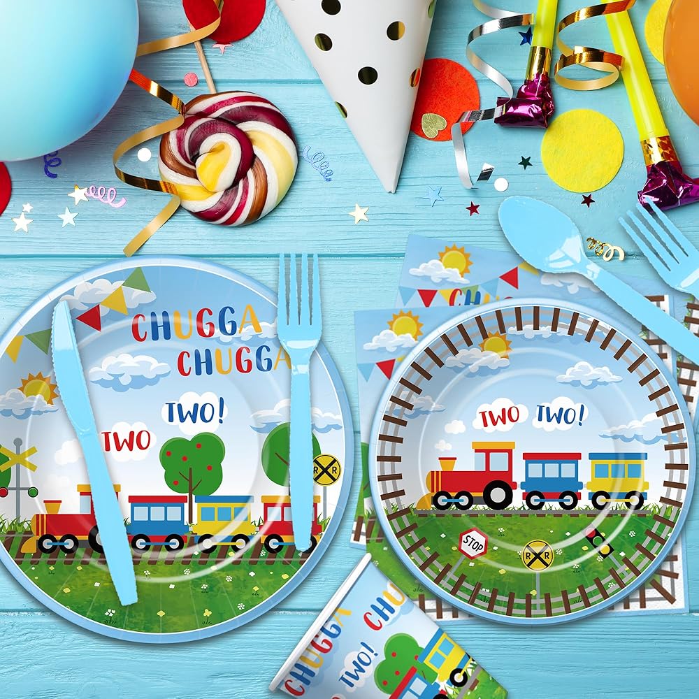 【Train Party Supplies】Transform your party into a delightful celebration with this chugga chugga two two decorations dinnerware. From plates to cups, and napkins, each item is adorned with vibrant transportation train illustrations, creating a cohesive and eye-catching theme for your celebration