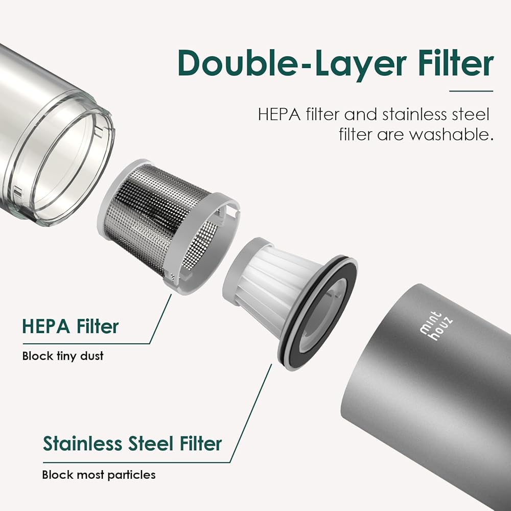 【لاسلكية وخفيفة الوزن】حجم زجاجة مياه معدنية ووزن خفيف 1.08 كجم، مما يجعل من السهل حملها واستخدامها في أي مكان. يمكنك تنظيف الأرضيات والسجاد والمفروشات والأجزاء الداخلية للسيارة دون القلق بشأن الأسلاك الطويلة أو المعدات الثقيلة. بالإضافة إلى ذلك، يمكن تفريغ كوب الغبار اللاسلكي المحمول بسعة 210 مل والذي يمكن تفريغه وتنظيفه بسهولة، ويمكن غسل وإعادة استخدام مرشحات الفولاذ المقاوم للصدأ وHEPA.