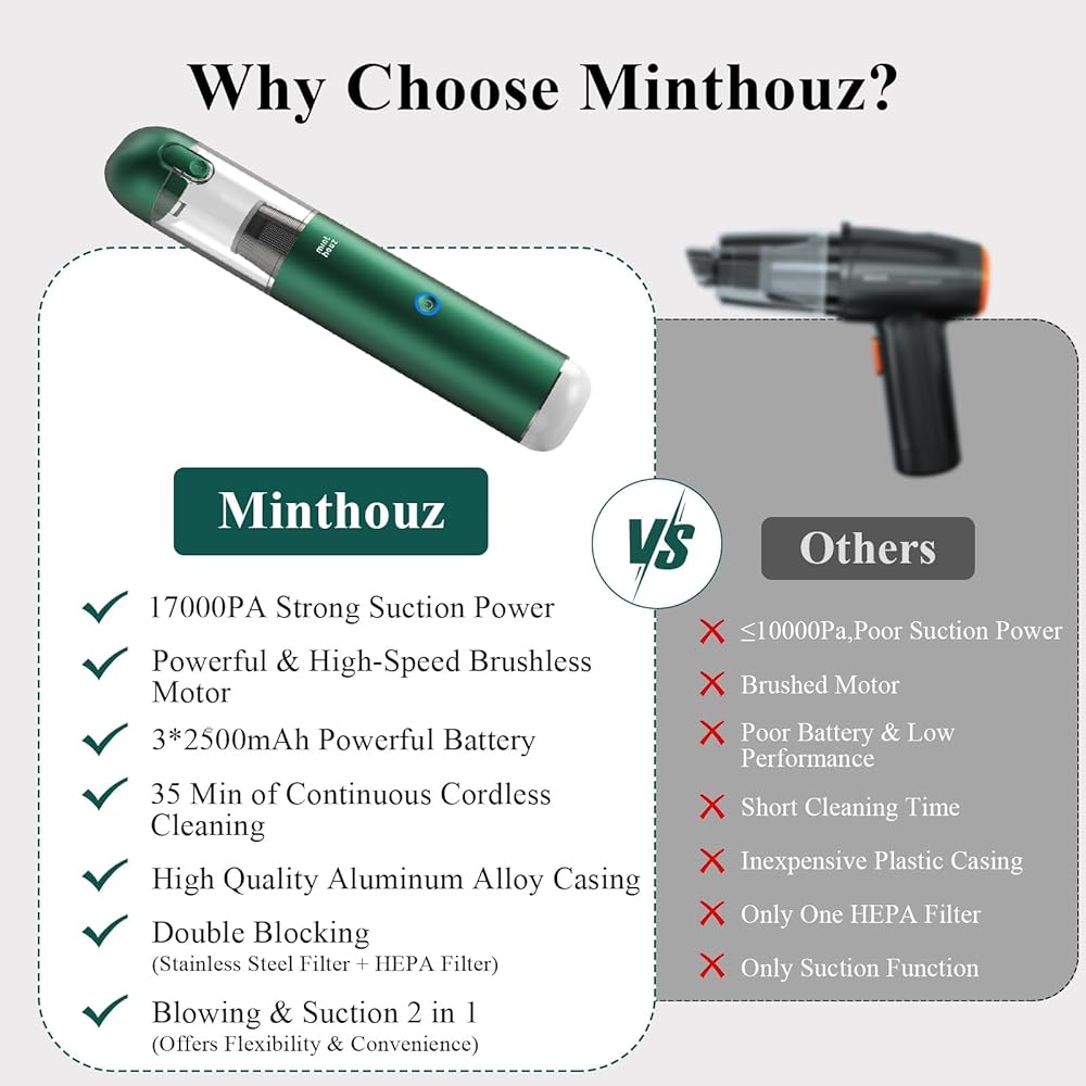 【ستكون مينثوز معك دائمًا】تأتي مكنسة السيارة اللاسلكية عالية الطاقة مع صندوق تخزين رائع، مما يجعلها أفضل هدية مثالية للعائلة أو الأصدقاء! تلتزم Minthouz بتزويد العملاء بتجربة تسوق بأعلى جودة، وإذا كانت لديك أي مشكلات، فيرجى الاتصال بنا، وسنساعدك على حل مشكلاتك في غضون 24 ساعة وخدمة عملاء ودودة مدى الحياة.