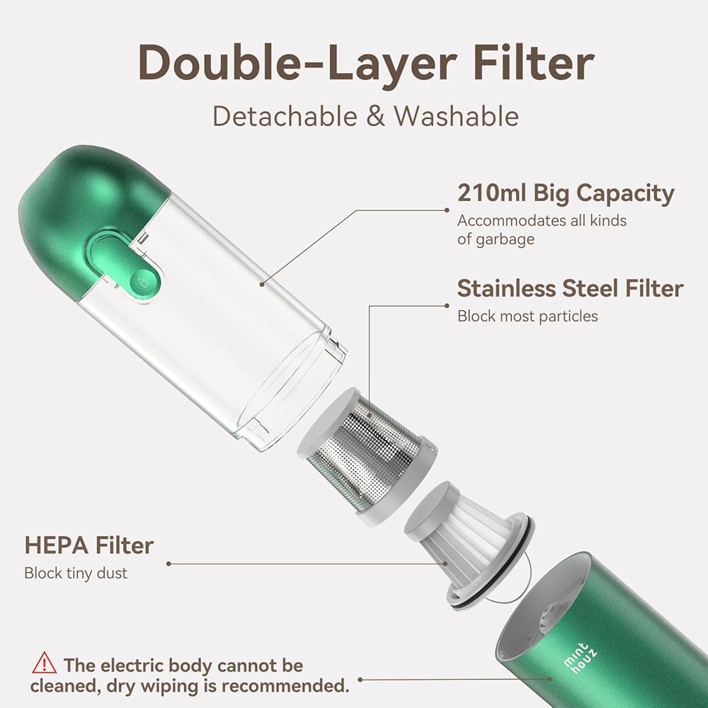 [مادة ألومنيوم آمنة] هذه المكنسة الكهربائية الصغيرة اللاسلكية مصنوعة من مادة أكريلونتريل بوتادين ستايرين عالية الجودة وسبائك الألومنيوم، وهي متينة وخفيفة الوزن. يتكون الفلتر من مادة HEPA عالية الكثافة التي تساعد على التقاط واحتجاز معظم جزيئات الغبار الصغيرة جدًا التي لا يمكن رؤيتها بالعين المجردة، وتنظيف الهواء ومنعها من الهروب مرة أخرى إلى الهواء أو اتساخ يديك .