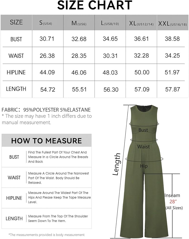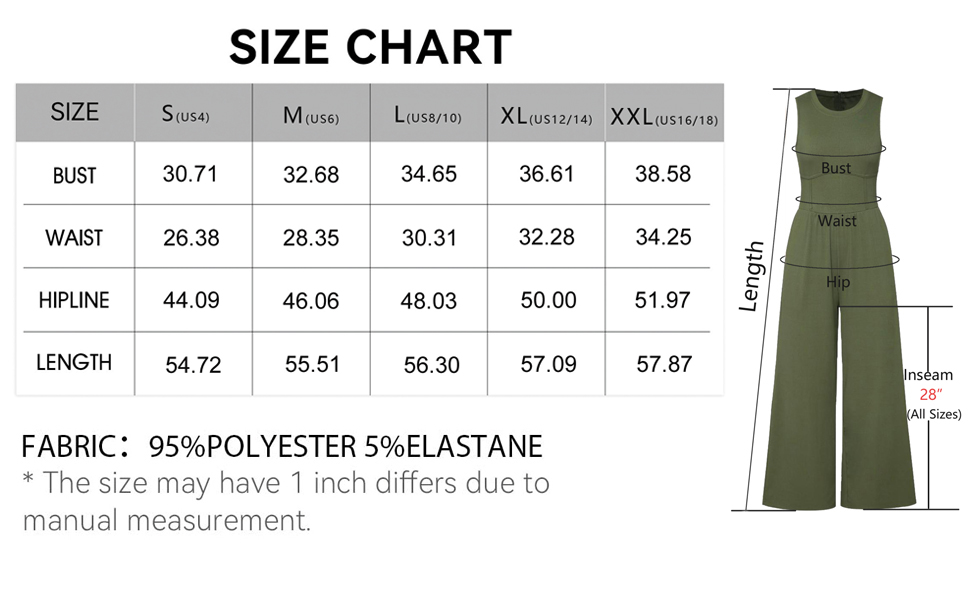 Size: Small=US 4, Medium=US 6, Large=US 8/10, X-Large=US 12/14, XX-Large=US 16/18. Material: Laviqk Women's Jumpsuit Crafted with a blend of polyester and elastane, super soft and comfy summer wide-leg jumpsuit with pockets. elastic and stretchable, flexible and breathable, comfortable to wear. Not see-through.