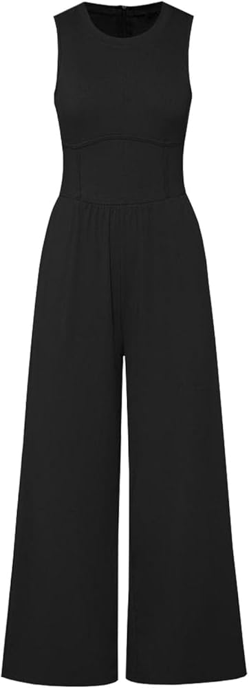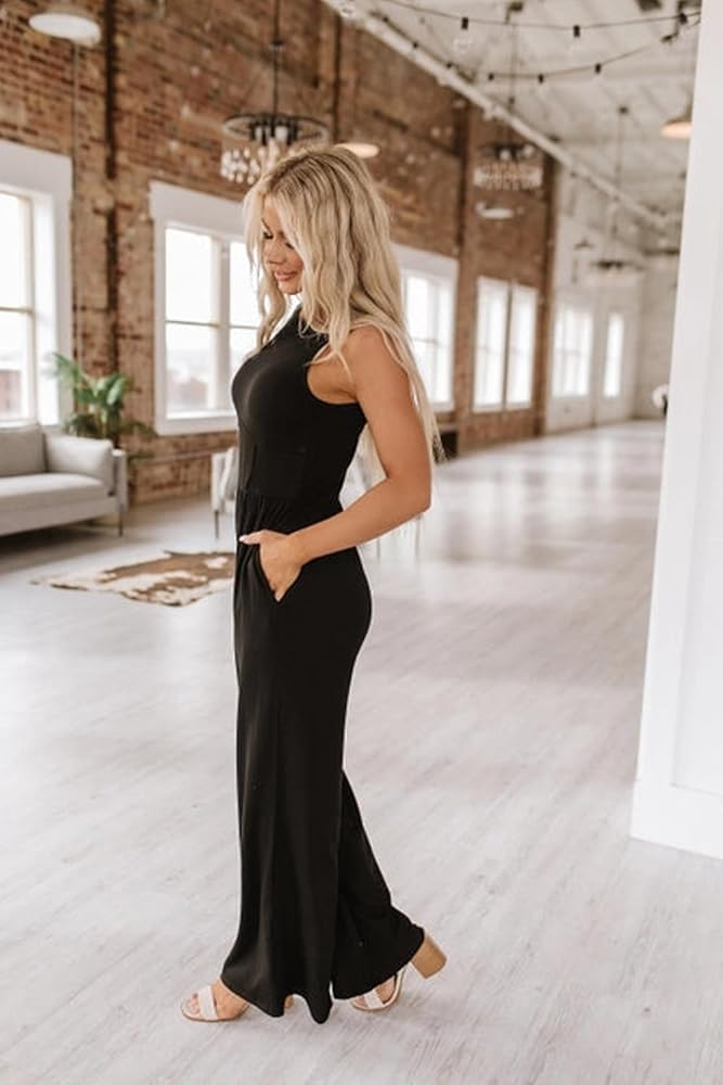 Feature: Zipper back One Piece Sleeveless Jumpsuits, Mid Rise Waist for Flattering Shape, Crew Neck, Wide Leg Pants, Two Side Pockets, Solid Color, Stretchable Long Pants Jumpsuit, Loose Fit, Casual Style. A must-have for anyone wanting to stay on-trend with comfort.