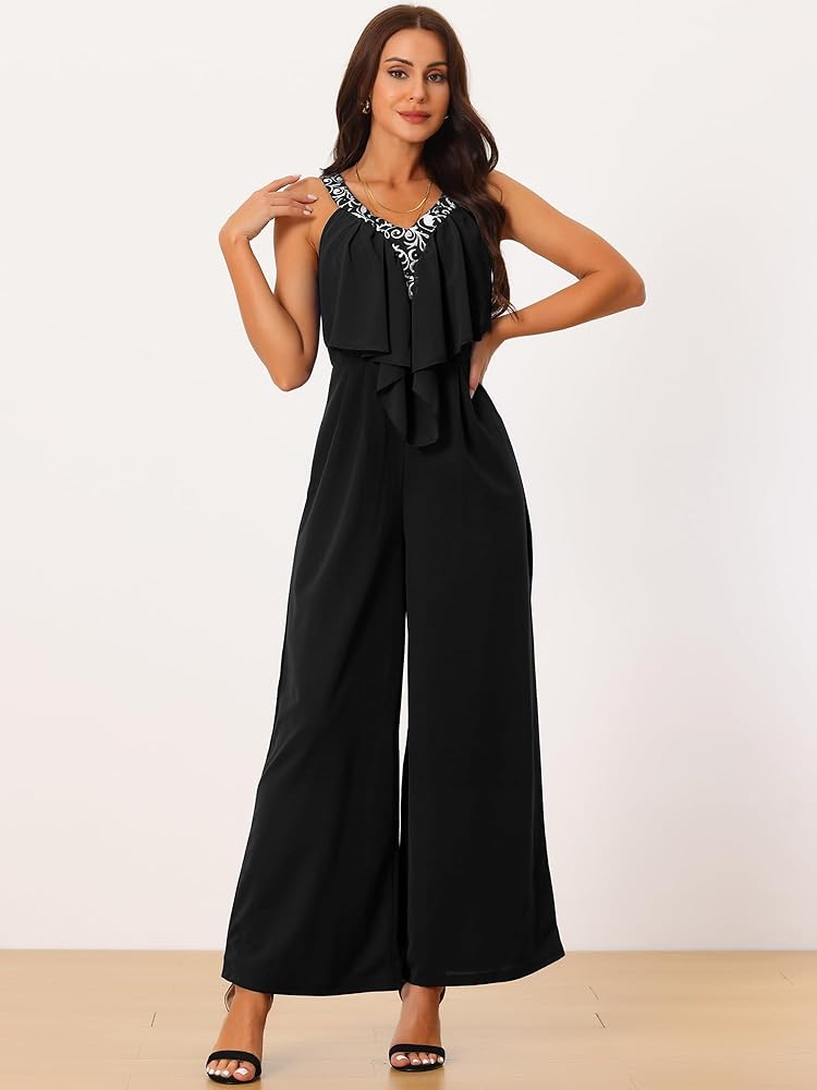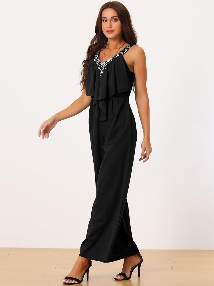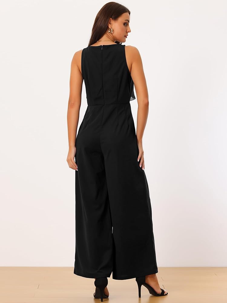 الميزات: بذلة واسعة الساق للنساء / بذلة بدون أكمام برقبة على شكل حرف V / كشكش / خصر مرتفع / سحاب خلفي للإغلاق / سراويل طويلة / قماش قابل للتمدد
