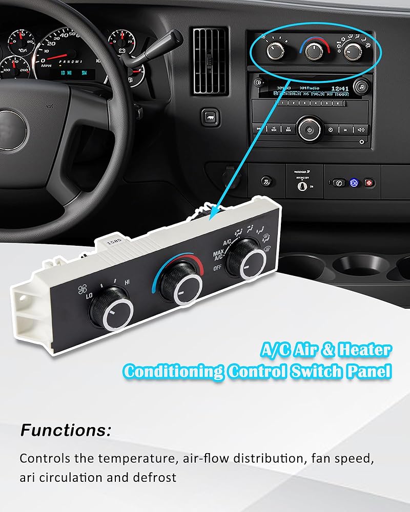 Compatibility for GMC: This A/C instrument panel compatible with 1996 GMC G3500|1996-2005 GMC Safari|1996-2014 GMC Savana 1500|1996-2020 GMC Savana 2500|1996-2020 GMC Savana 3500|2009-2019 GMC Savana 4500|2003-2009 GMC C4500 Topkick|2003-2009 GMC C5500 Topkick|2003-2009 GMC C6500 Topkick|2003-2009 GMC C7500 Topkick|2003-2009 GMC C8500 Topkick