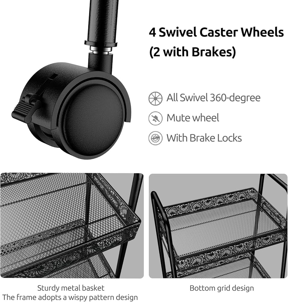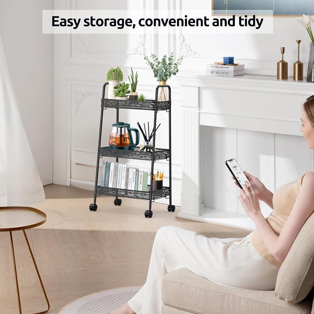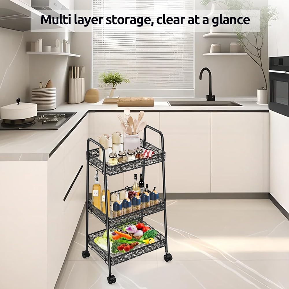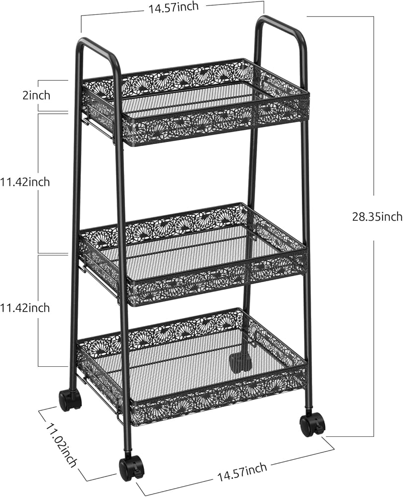 مساحة تخزين واسعة: تتميز هذه العربة الدوارة بثلاثة طبقات من الأرفف، مما يوفر مساحة تخزين واسعة لمختلف العناصر في حمامك أو مطبخك أو جراجك أو مكتبك. الطبقة العلوية مثالية لتخزين المناشف أو مستحضرات التجميل أو غيرها من أشتات الشمس، بينما يمكن للطبقتين الوسطى والسفلية حمل أشياء أكبر مثل مستلزمات التنظيف أو الكتب أو أدوات المطبخ.