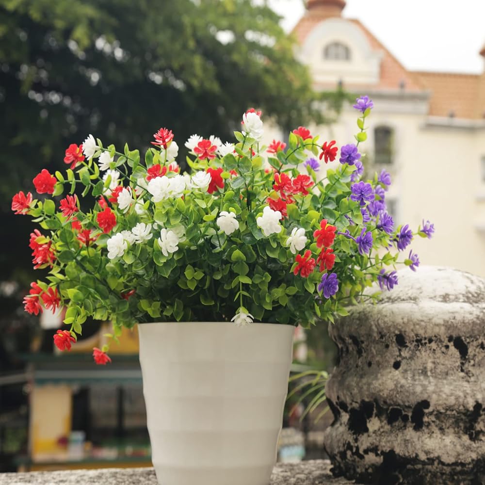 • 【Size Feature】:8 bundles Fake flowers outdoor.These flowers are handmade to offer, Each bouquet has 7 flexible stems and bushy leaves. Each measures 14" high x 9" Wide.Because the branches of the flowers are very flexible,You just need to make a few adjustments to make the flowers look more fluffy. If found petal falls, just plug it back in the stem.