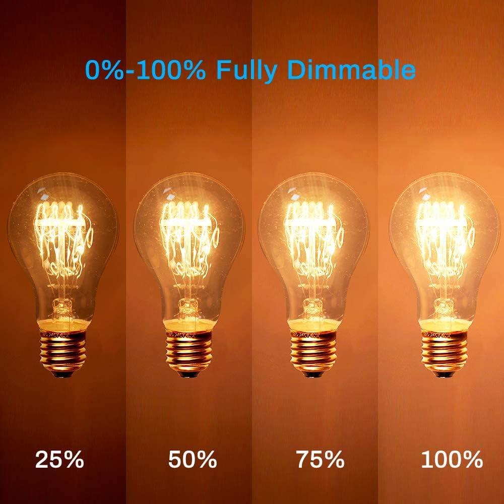Dimmable: You can adjust the brightness of the light as you like and need. Classic A19 Edison style 2100K warm white glow, 360 degrees beam angle produces relaxing , comfortable and intimate atmosphere.
