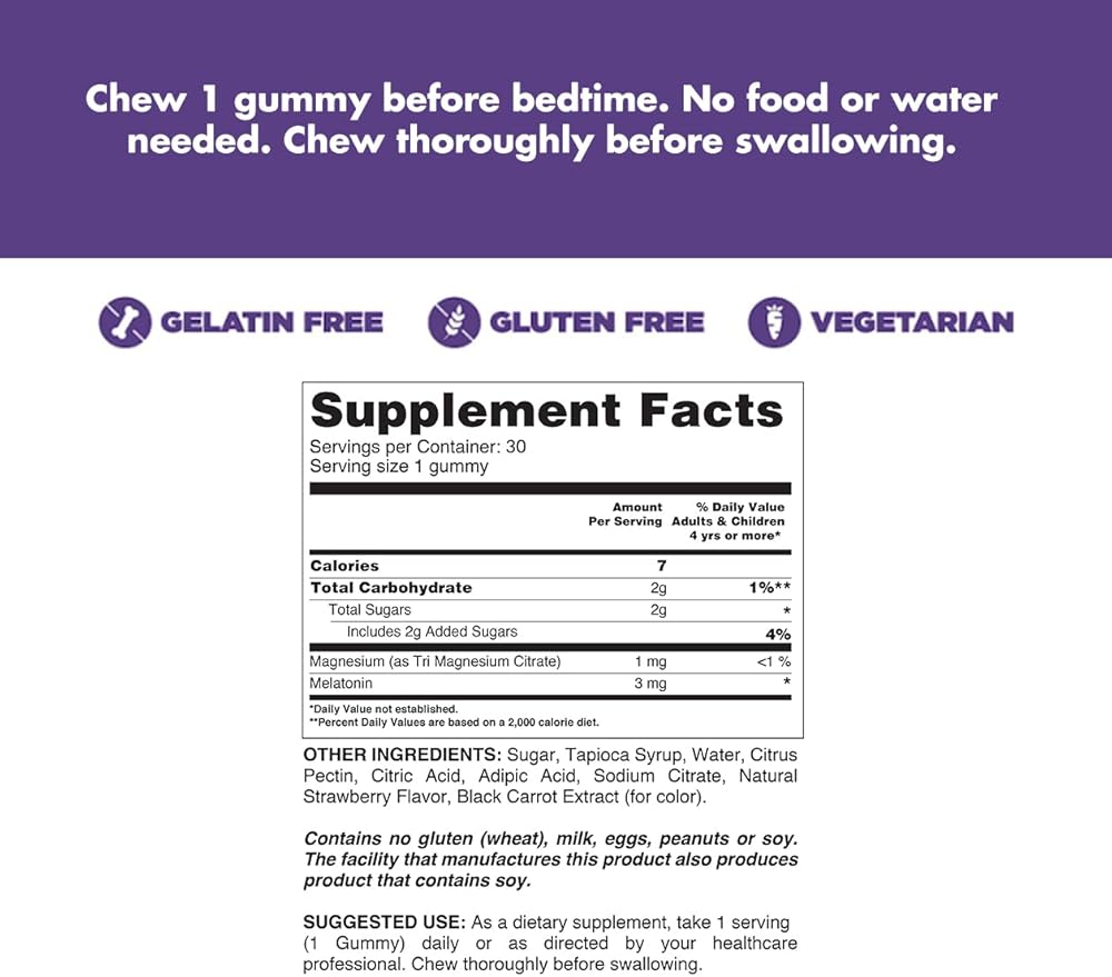 الميلاتونين 3 ملغ من مضغ النوم للبالغين مع 1 ملغ من المغنيسيوم | علكات نباتية نائمة طبيعية 100% قابلة للمضغ (نكهة الفراولة - 30 علكة) مصنوعة في الولايات المتحدة الأمريكية