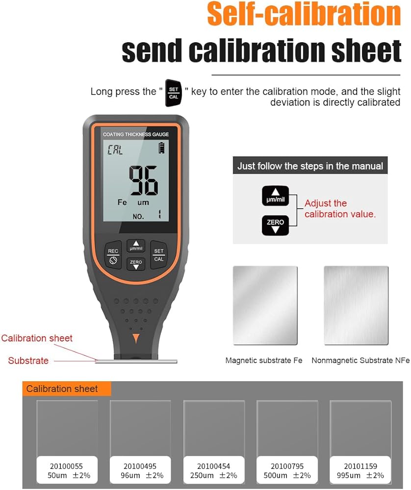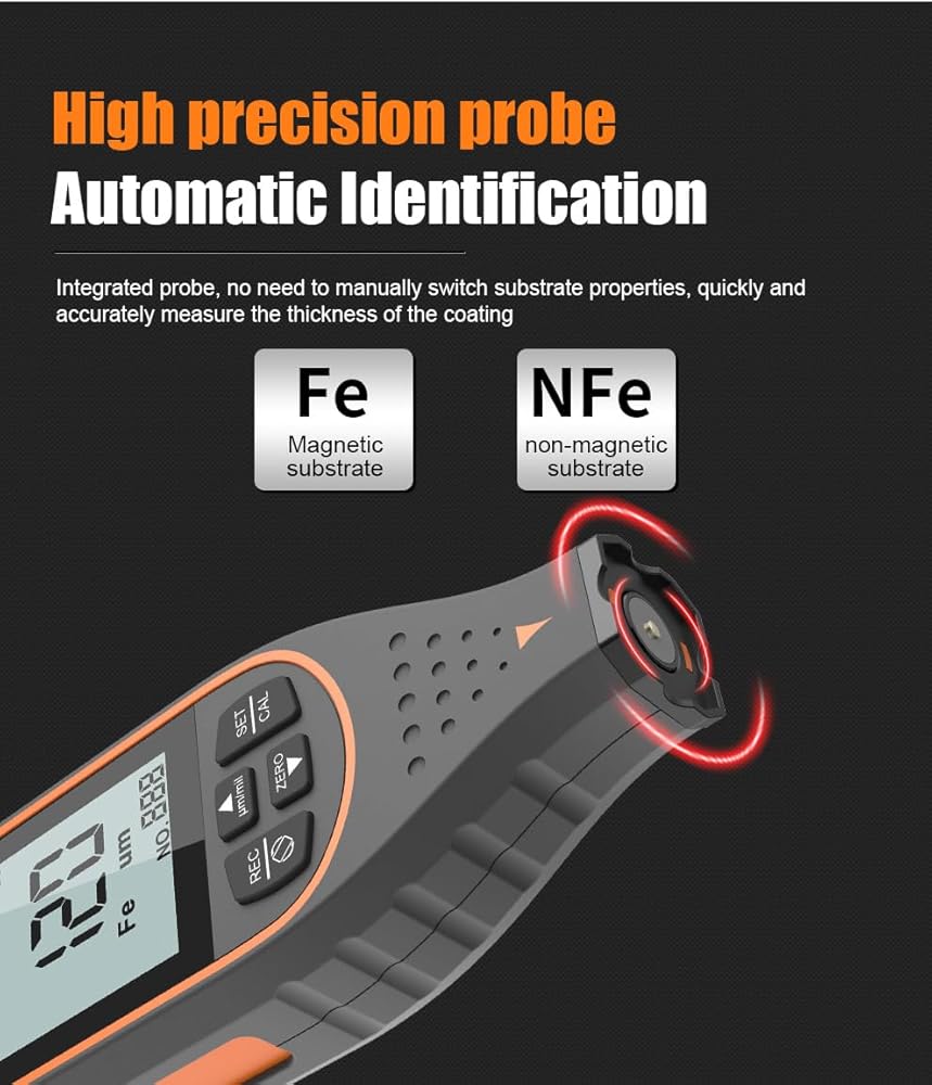 • مقياس سمك الطلاء هذا مزود بمسبار عالي الدقة يتعرف تلقائيًا على الركائز، ويزيل مقياس سمك الطلاء الكل في واحد الحاجة إلى تبديل الركيزة يدويًا. يوفر قياسات سريعة ودقيقة لسمك الطلاء بعد بداية المعايرة الذاتية.