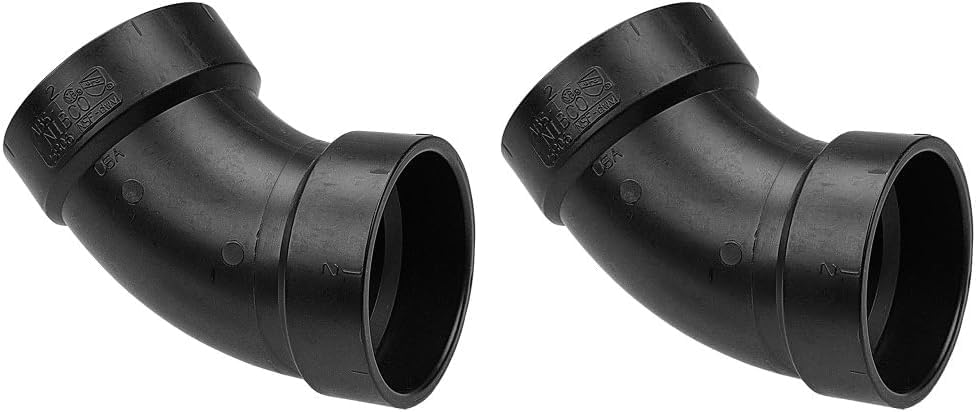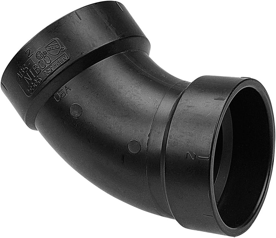 The NIBCO 5806 schedule 40 45-degree elbow pipe fitting is made of acrylonitrile butadiene styrene (ABS) for use in drain, waste, and vent systems (DWV) and has hub connections. This 45-degree elbow fitting, or "ell," connects two pipes at a 45-degree angle to change the direction of flow between pipes. It has female hub openings for sliding over the ends of male pipes. The hub end connects to pipes with a smooth bore for enhanced flow. This schedule 40 (standard wall) fitting is made of acrylonitrile butadiene styrene (ABS) for use in non-pressure residential and commercial drain, waste, and vent (DWV) sanitary systems. ABS resists most household chemicals and many corrosive and abrasive industrial liquids, performs under a wide temperature range, has high impact resistance, and is lighter in weight than metal for simple installation above or below ground. This fitting is compatible with schedule 40 ABS-DWV and can be connected to other materials such as steel, copper, or cast iron using transition fittings. This fitting provides superior flow to metal because of its smooth interior finish, which reduces friction and inhibits buildup of materials. This fitting meets American Society for Testing and Materials (ASTM) D2661 and D3311 specifications for quality assurance.
