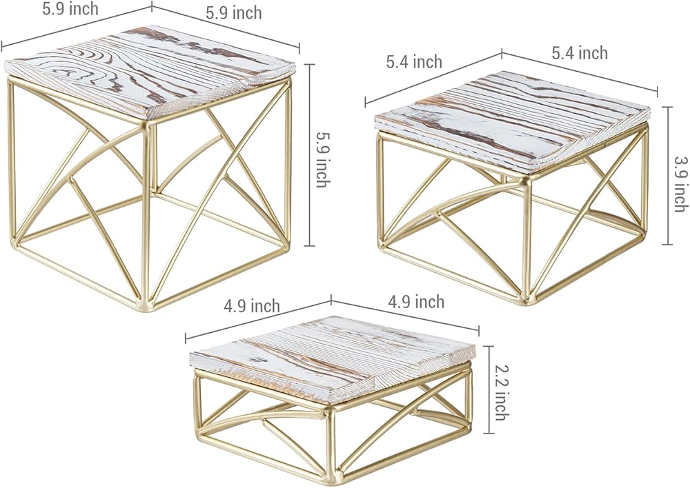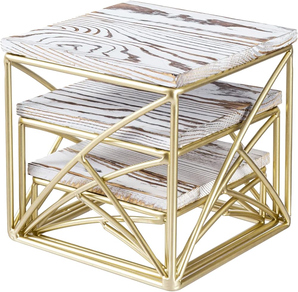 مجموعة من 3 حاملات حلوى مربعة عصرية على سطح الطاولة مع رف علوي من الخشب الأبيض الأنيق وقاعدة سلكية معدنية هندسية نحاسية.