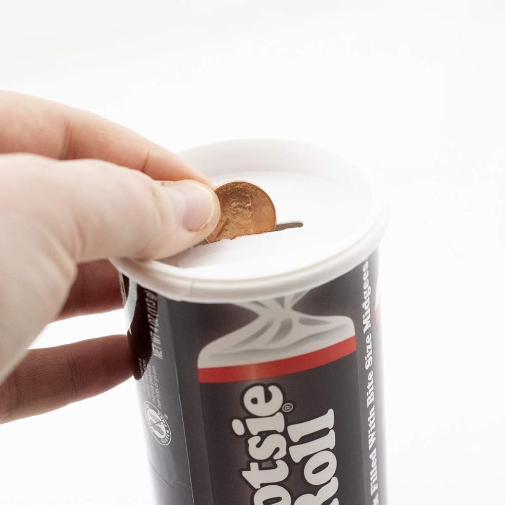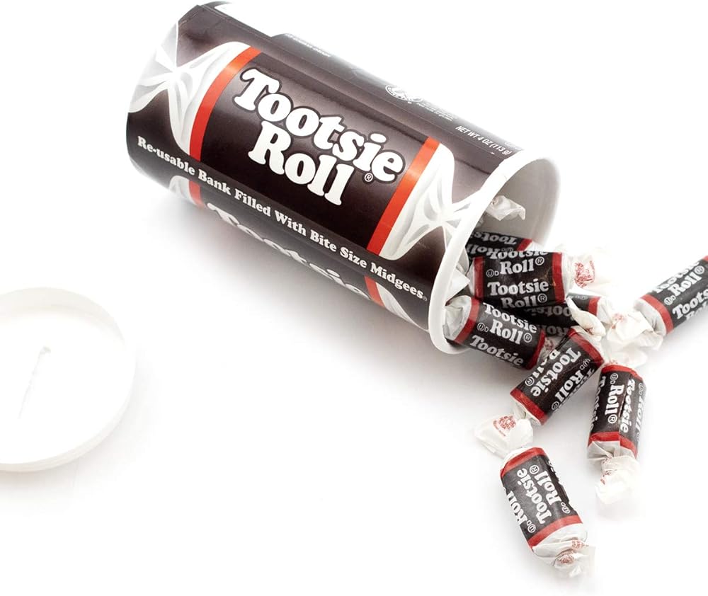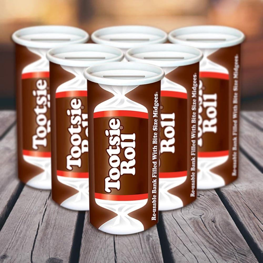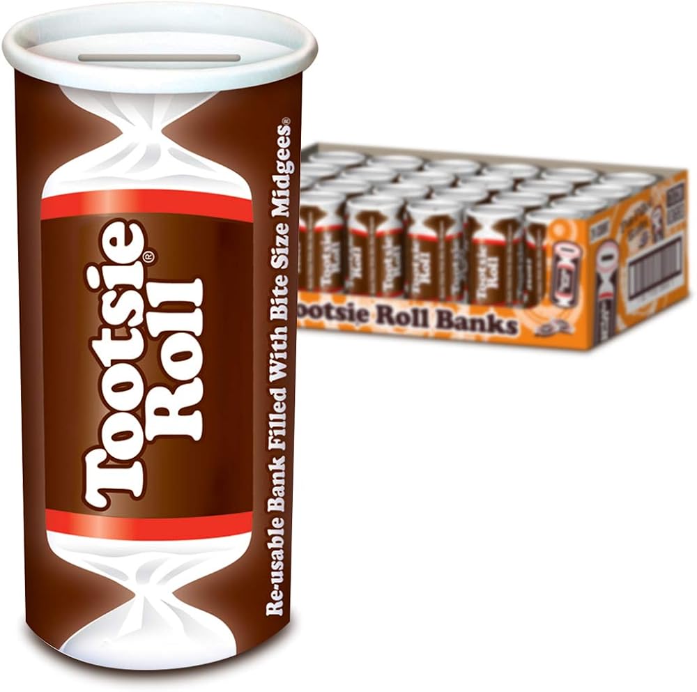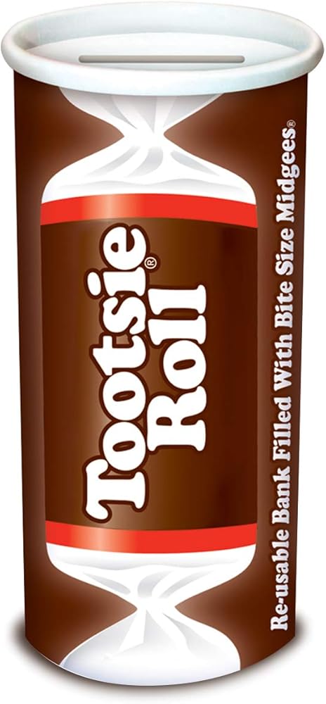 The classic Tootsie Roll bank filled with Tootsie Roll Midgees. Great for kids' party favors, Halloween, stocking stuffers. Keep your loose change in one place with the reusable bank after you enjoy all the Tootsie Rolls!