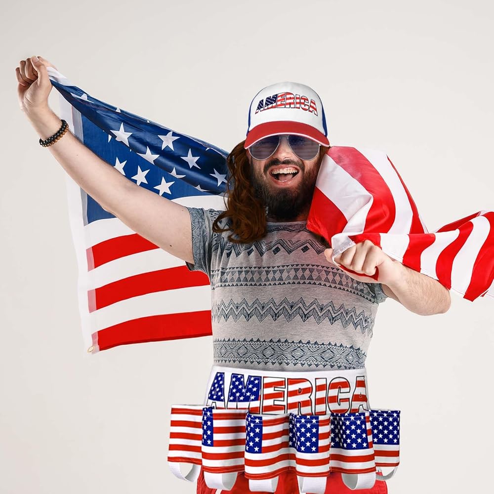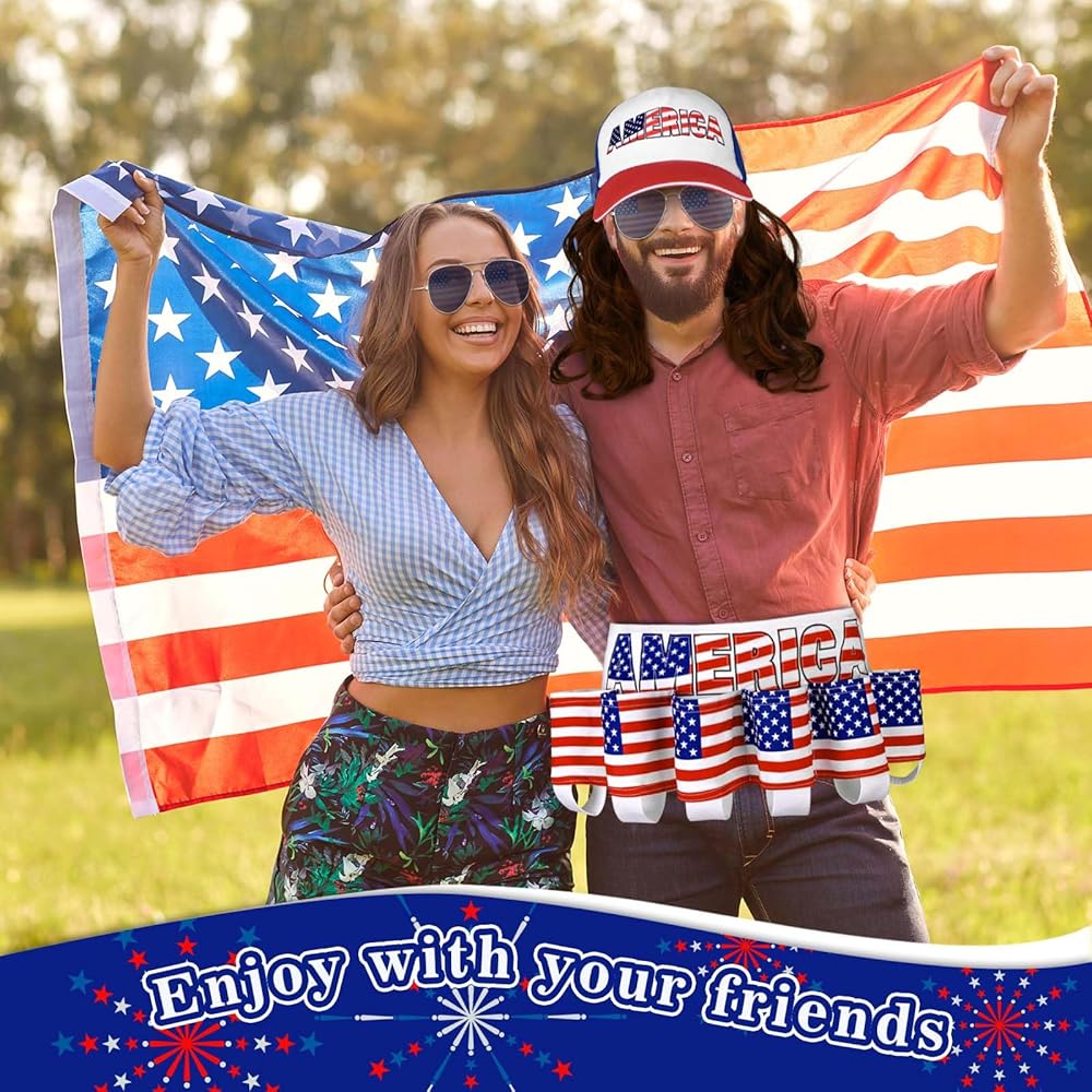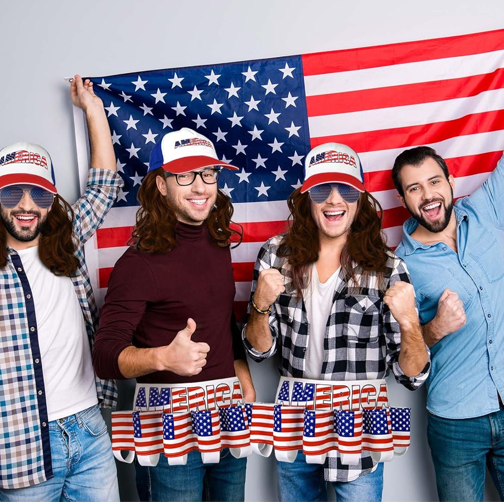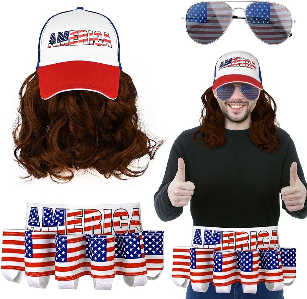 Reliable Material: This patriotic beverage belt is mainly made of polyester, strong and durable, soft and comfortable. The mullet hat is mainly made of polyester, strong and wear-resistant, and the wig is made of polypropylene, smooth and soft. The sunglasses are made of metal frames and composite lenses, lightweight and sturdy.