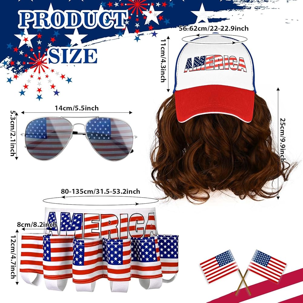 3 قطع من إكسسوارات الرابع من يوليو، حامل حزام وطني وقبعة البوري، شعر مستعار العلم الأمريكي، نظارات شمسية بيضاء لحفلات القمامة، ملابس كلاسيكية لعيد الاستقلال في الثمانينات