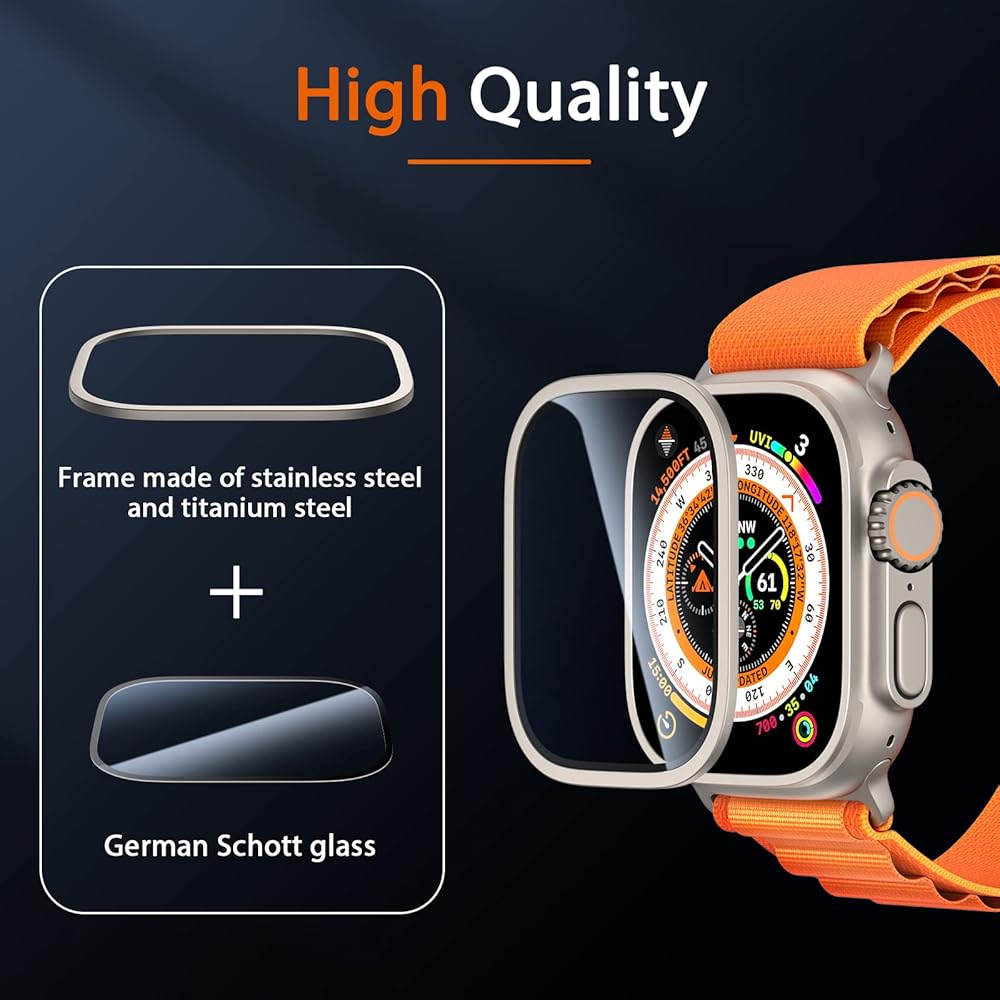 واقي شاشة لساعة Apple Watch Ultra 2 مقاس 49 مم، غطاء إطار من التيتانيوم + غطاء حماية كامل للوجه من الزجاج المقسى لساعة Apple Watch Ultra 49 مم، خالي من الفقاعات، حساس للمس