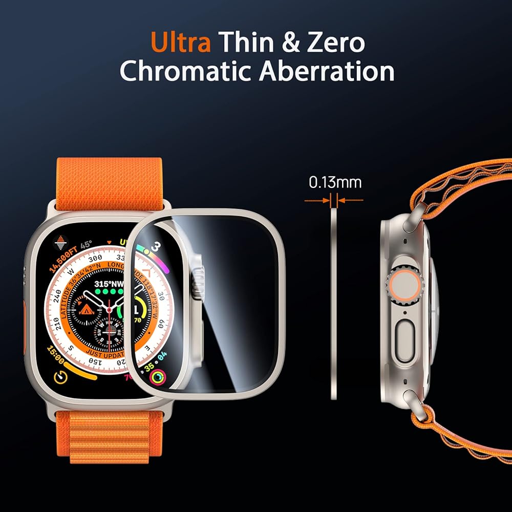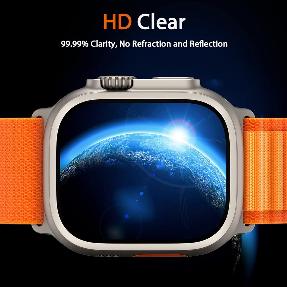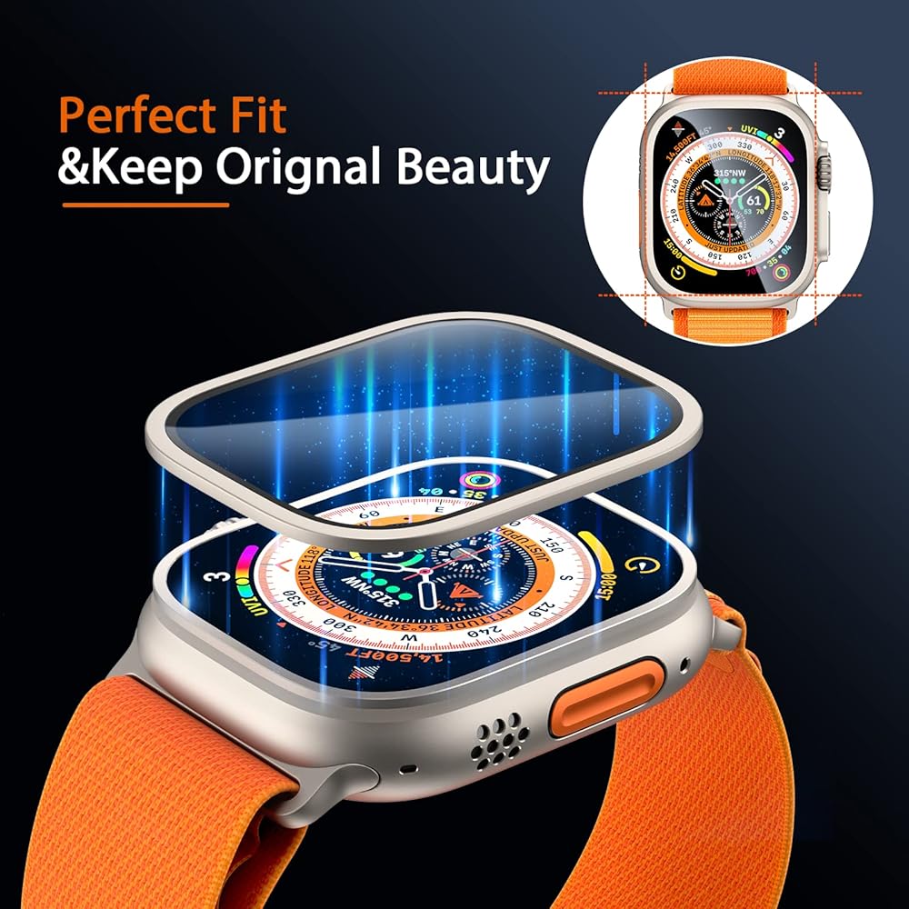 【حماية مزدوجة】الإطار + الغشاء، والإطار الخاص بنا، والغشاء منفصلان لتجنب فقاعات الهواء. قم بلصق الإطار أولاً، ثم قم بتصويره، بحيث تكون العملية بأكملها أكثر سلاسة. حافظ على Apple Watch Ultra في شكل أصلي للغاية مع حماية Apple Watch Ultra من خدوش الحياة اليومية.