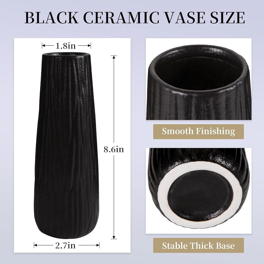 حجم المزهرية: 2.7 بوصة (طول) × 1.8 بوصة (عرض) × 8.6 بوصة (ارتفاع)، يبلغ ارتفاع هذه المزهرية المصنوعة من السيراميك الأسود للزينة حوالي 8.6 بوصة، و1.8 بوصة في القطر العلوي و2.7 بوصة في القطر السفلي. عندما تضع الزهور، ستفاجأ عندما تجد أنها مناسبة تمامًا للباقة.