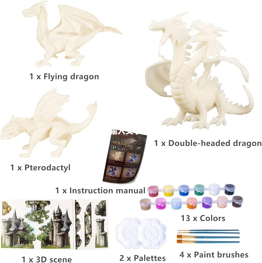 • [مجموعة ألعاب التنين التي تصنعها بنفسك] تتضمن هذه المجموعة الفنية 3 تنانين قابلة للطلاء، و13 علبة طلاء بالألوان المائية، و4 فرش، و2 لوح ألوان، ومشهد قلعة ثلاثي الأبعاد، والتعليمات. مجموعة غنية، تستحق الشراء، لا داعي للشك في غيرها.