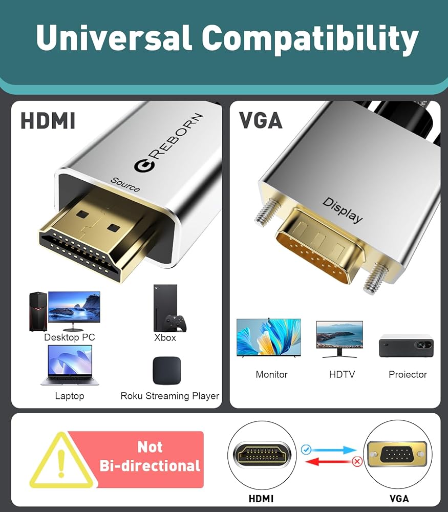 متوافق عالميًا: يمكن استخدام كابل HDMI إلى VGA للأجهزة ذات منفذ HDMI، مثل أجهزة الكمبيوتر المتوافقة، وأجهزة الكمبيوتر الشخصية، وأجهزة الكمبيوتر المكتبية، وأجهزة الكمبيوتر المحمولة، وأجهزة الكمبيوتر المحمولة، وأجهزة الكمبيوتر المحمولة، وأجهزة Chromebook، وRaspberry Pi، وIntel Nuc، وRoku، وPS3، وXbox One، وXbox 360، أجهزة الاستقبال أو صناديق التلفزيون أو الأجهزة الأخرى المزودة بمنفذ HDMI. غير متوافق مع KVM/Hub/Docking/PS 5/4/VR