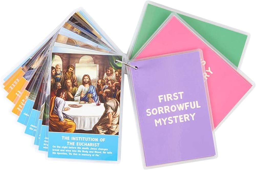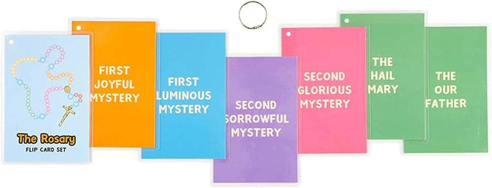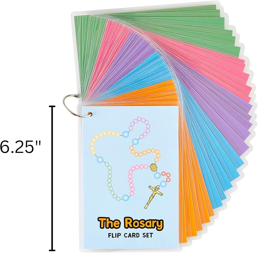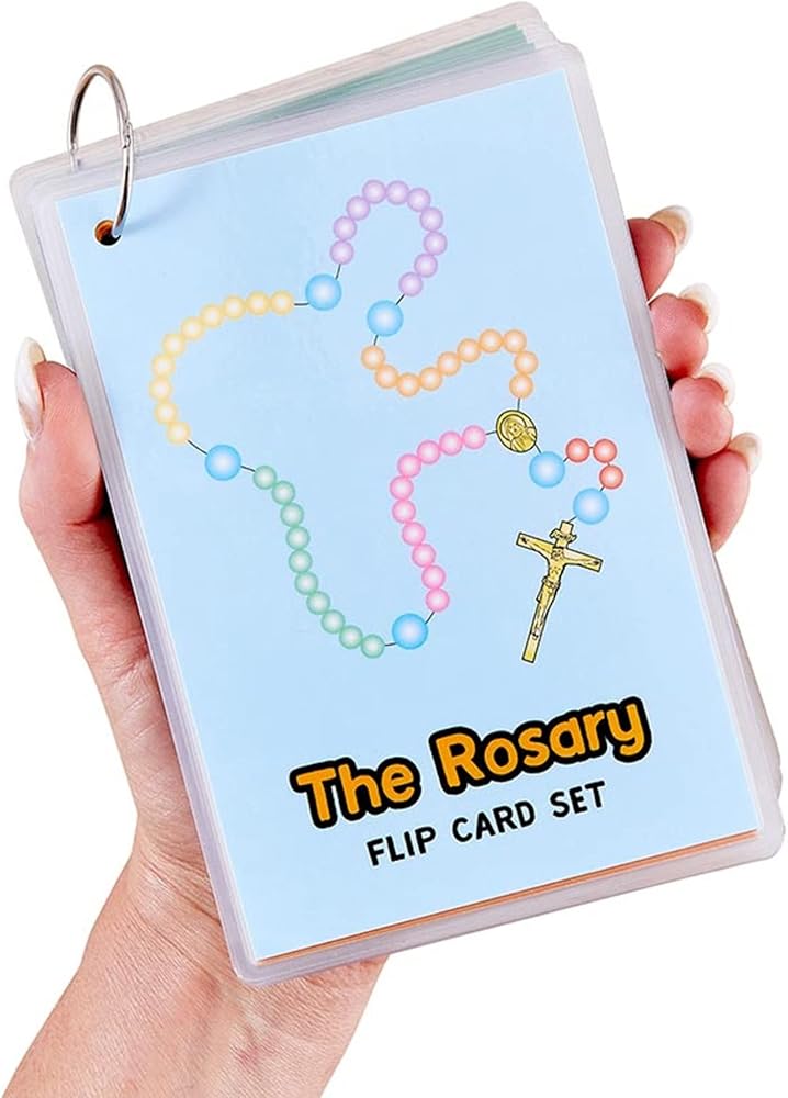 FLIP CARD SET - Learn how to pray the rosary on this jumbo flip card set. Set includes 27 - 6.25 inch jumbo cards. EASY TO CARRY AROUND - The laminated cards are durable and waterproof, so you can take them with you wherever you go! They're also held together by a split metal ring, making them a great activity on the go. SUNDAY SCHOOL & HOMESCHOOLING - This game set is perfect for use in Sunday school or homeschooling. Help your students or kids learn in a fun way. A FUN WAY TO LEARN - These jumbo flip cards make learning how to pray the Rosary a fun and interactive experience for children of all ages! The large, colorful illustrations on each card will keep kids engaged as they learn about the different mysteries of the Rosary. PERFECT FOR GIFTING - This set is perfect for any child or classroom. It makes a great gift for Easter, Christmas, or any special occasion.
