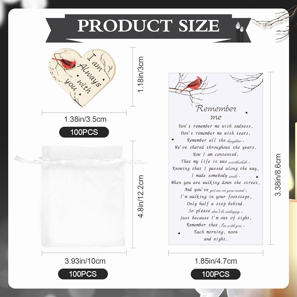 🤍كمية وفيرة: تتضمن الهدية التذكارية الكاردينال 100 قطعة من القلوب الخشبية، و100 قطعة من أكياس الأورجانزا، و100 قطعة من البطاقات الكاردينال. جلب ذكرى لأحبائك الذين ماتوا، صندوق هدايا رائع، كمية كافية، كافية لتلبية احتياجاتك الجنائزية.