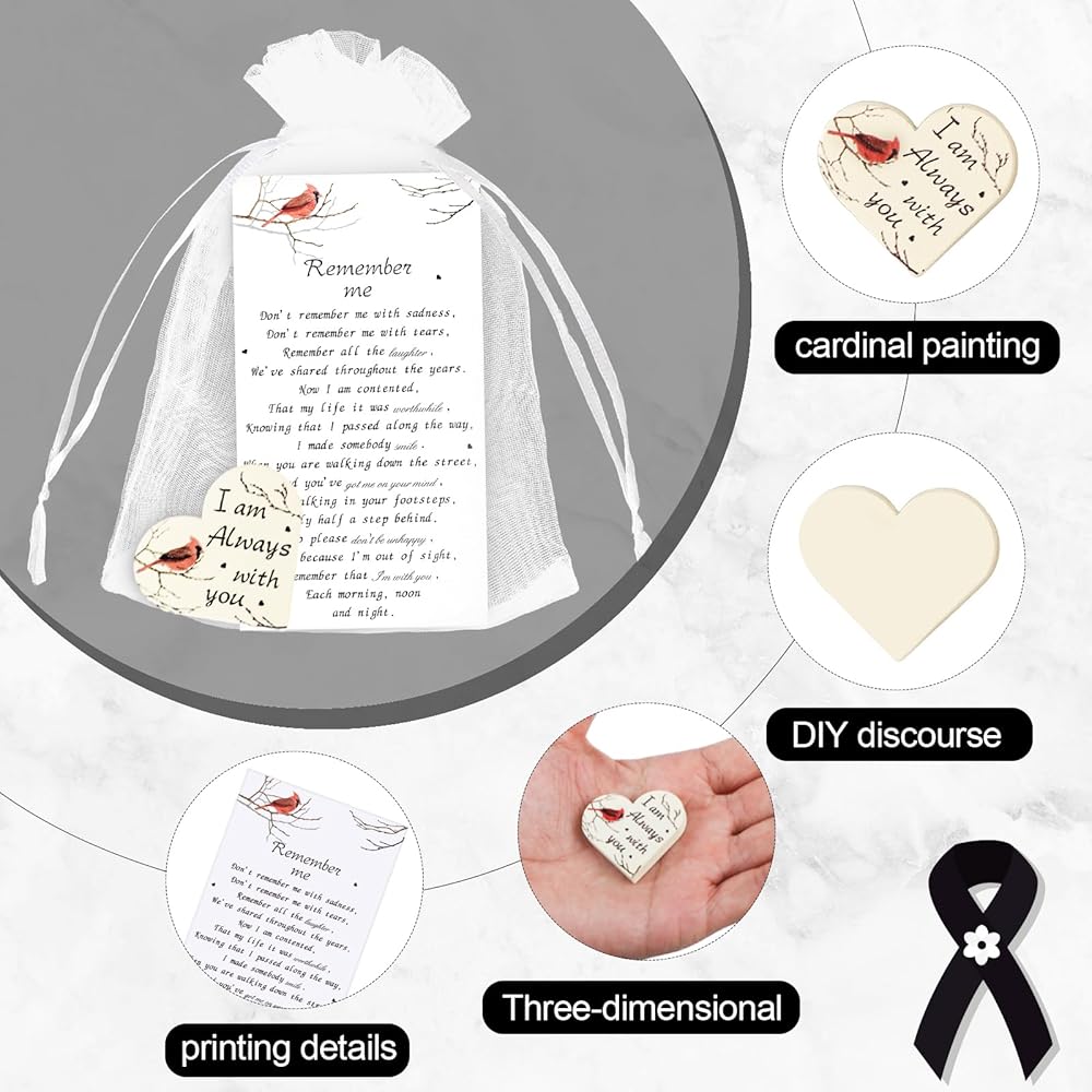 🤍هدية التعاطف: كل رمز خشبي يحمل صورة الكاردينال الأحمر، رمز الأمل والحب والاتصال الروحي. مصحوبة بكلمات "سأكون معك دائمًا"، الرابطة الأبدية المشتركة مع الأحباء الراحلين. بالإضافة إلى ذلك، تتميز بطاقات الصلاة المتضمنة بقصيدة مؤثرة، تقدم كلمات العزاء والطمأنينة خلال لحظات الحداد.