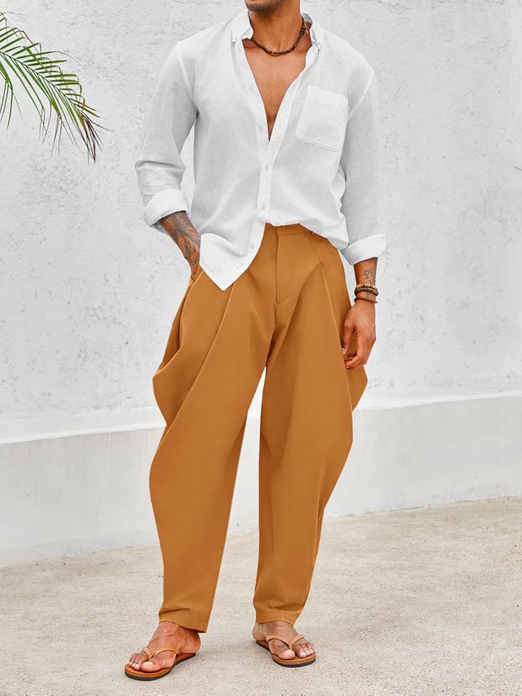 【المميزات】 سراويل هيبي القطنية هذه بنمط القفطان، تتميز بطيات أمامية، وجيبين جانبيين، وقماش مسامي، وساق مدببة، ولون ثابت، وتصميم مطوي منثنيات يضيف عنصرًا فريدًا وأنيقًا إلى ملابسك.