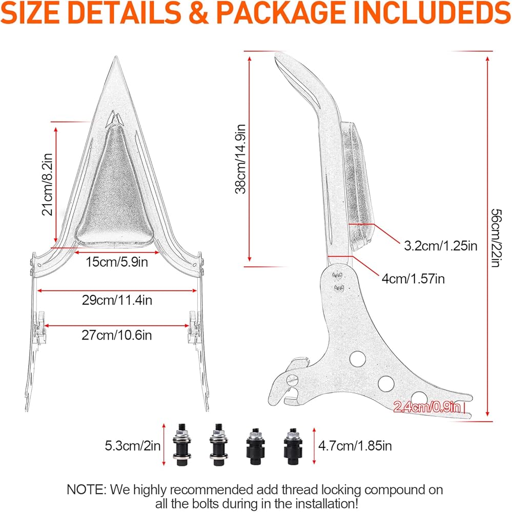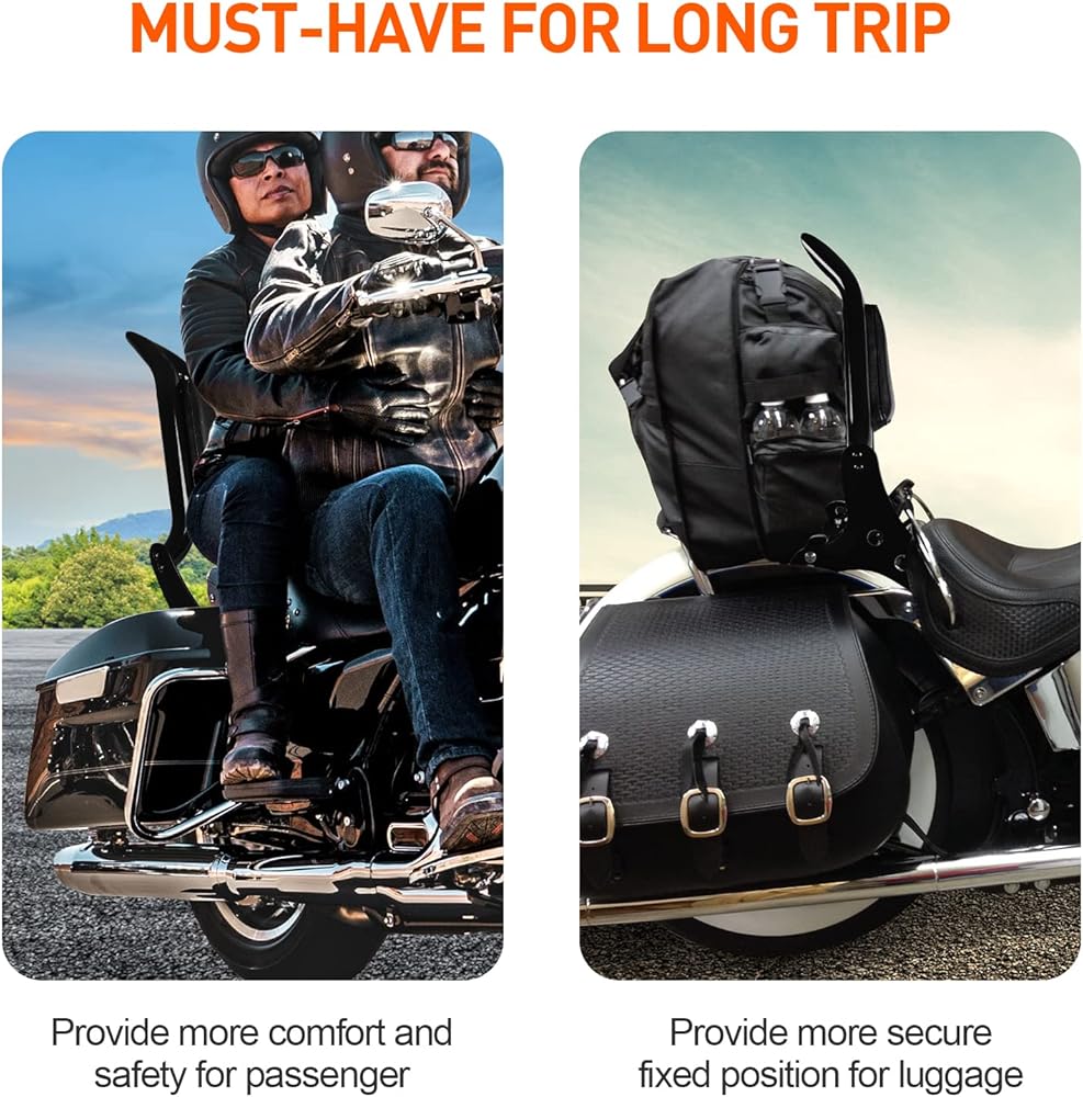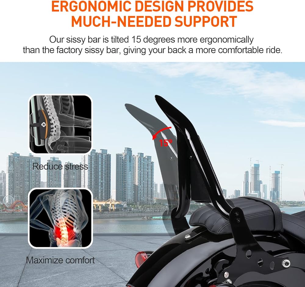 أضف المزيد من الراحة ► ► يتميز قضيب Sissy Bar القابل للفصل الخاص بنا بارتفاع طويل ويميل للخلف بمقدار 15 درجة مقارنة بالمصنع، هذه الزاوية تسمح لك بالاسترخاء في الخصر والعودة إلى الحد الأقصى. بالمقارنة مع الدراجات النارية بدون مسند للظهر، فإن مساند الظهر الخاصة بنا ستوفر للركاب المزيد من الأمان والمأوى من الرياح والأمطار، خاصة في الطقس البارد. بالإضافة إلى ذلك، فهو أيضًا مساعد جيد لحمل الأمتعة، سواء كانت حقيبة ظهر أو حاملة للحيوانات الأليفة، يمكن تثبيتها بسهولة وثباتها بما فيه الكفاية دون القلق من السقوط.