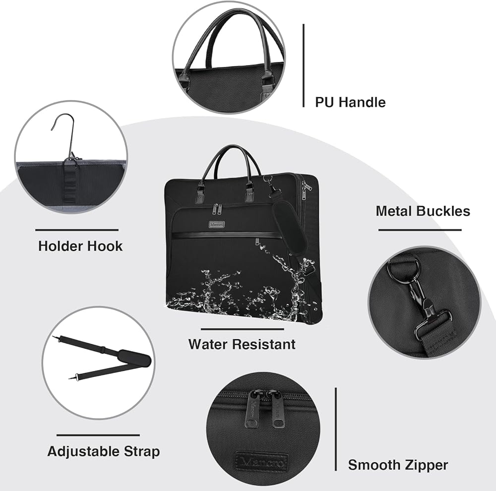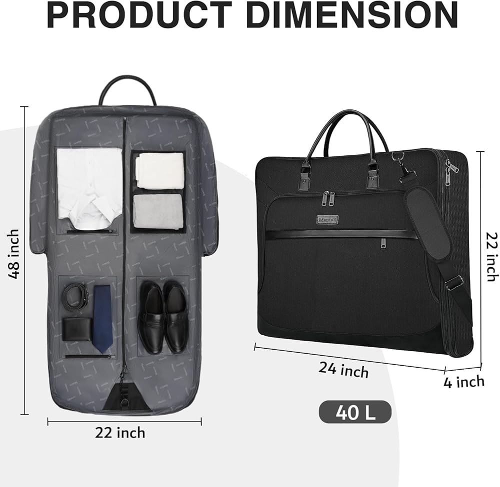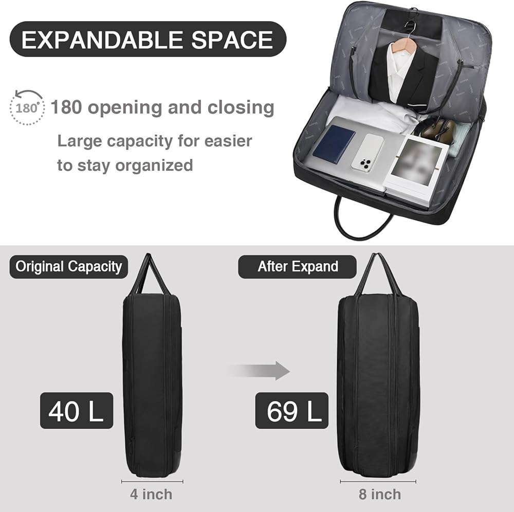 سعة كبيرة وقابلة للتوسيع: الحجم: 60.96 سم طولًا × 55.88 سم عرضًا × 10.16 سم ارتفاعًا وحجم الفتح 55.88 سم عرضًا × 112.7 سم طولًا، توفر لك حقائب Mancro Garment للسفر مع ميزة قابلة للتوسيع سعة تعبئة أكبر. قم بفك السحاب للحصول على مساحة تخزين تبلغ 69 لترًا، يمكن لحقيبة ملابس السفر أن تحمل بدلات التعبئة والكمبيوتر المحمول والمستندات وما إلى ذلك بسهولة.
