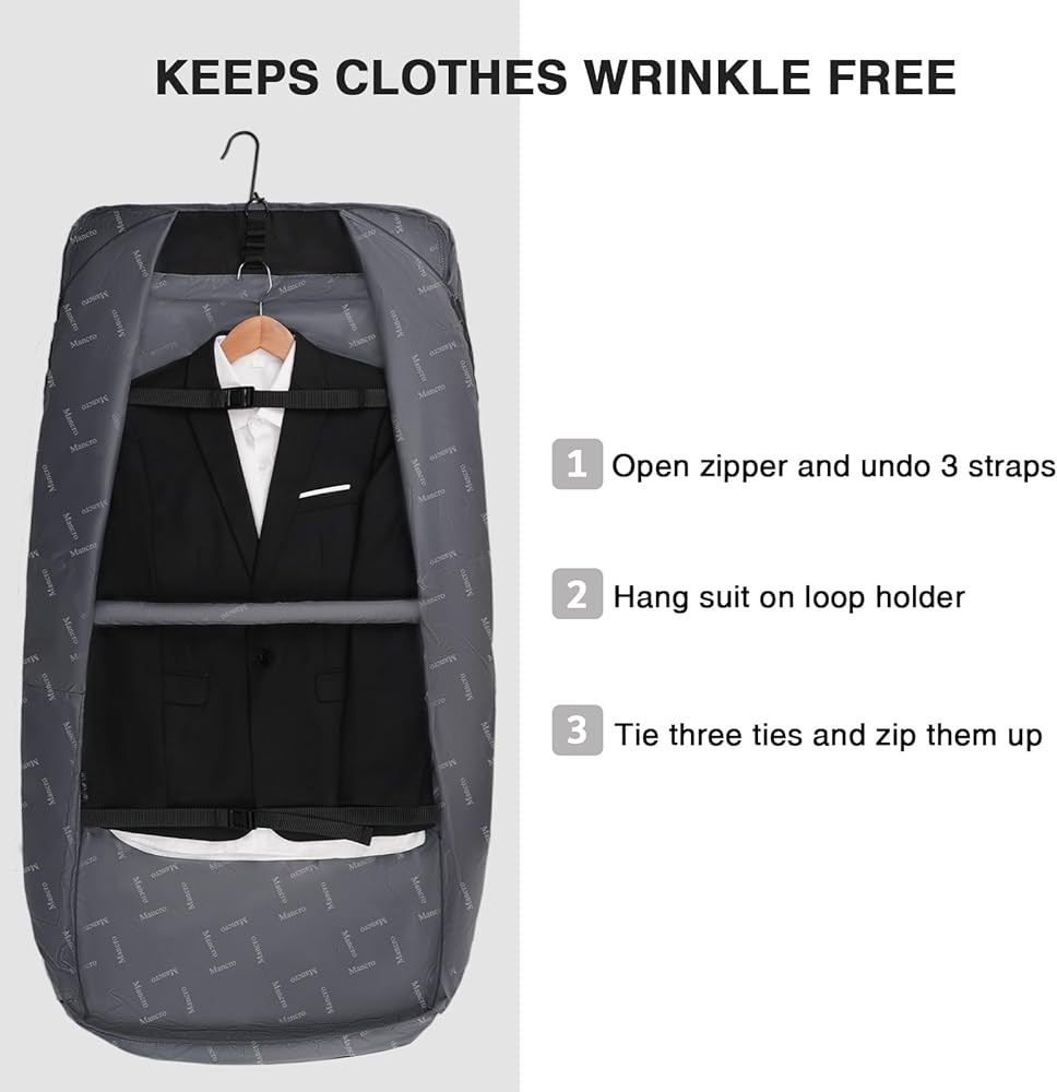 تحافظ على البدلات خالية من التجاعيد: تم تصميم حقيبة الملابس هذه خصيصًا للحفاظ على ملابسك نظيفة ومرتبة أثناء السفر. مع 3 حوامل حلقات داخلية، يمكنك بسهولة تعليق ما يصل إلى 3 بدلات كاملة. شريطان داخليان بإبزيم وحزام واحد مبطن بالفوم في المنتصف يمكنهما تثبيت البدلات/الفساتين في مكانها. بالإضافة إلى ذلك، تسمح لك الخطافات الداخلية بتعليق حقيبة البدلة الخاصة بك في غرفة الفندق الخاصة بك وجعل رحلات العمل أو السفر أكثر ملاءمة.