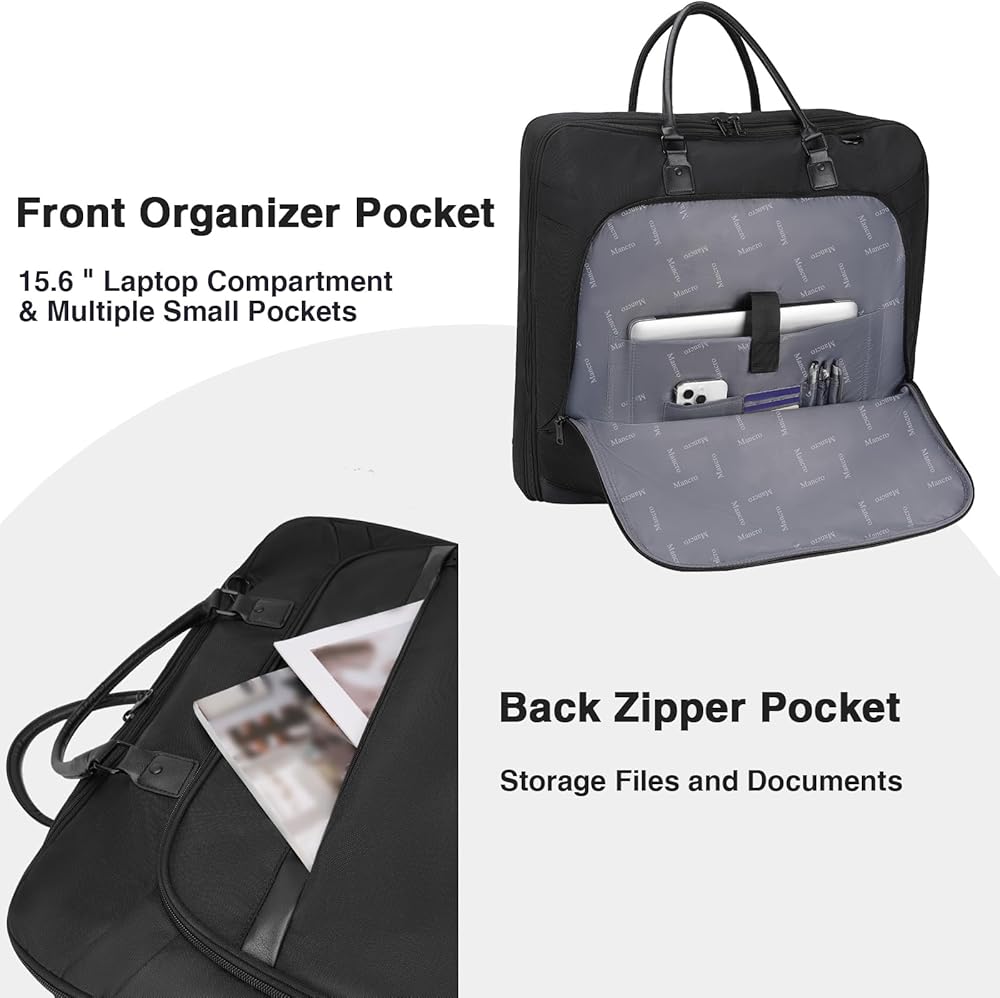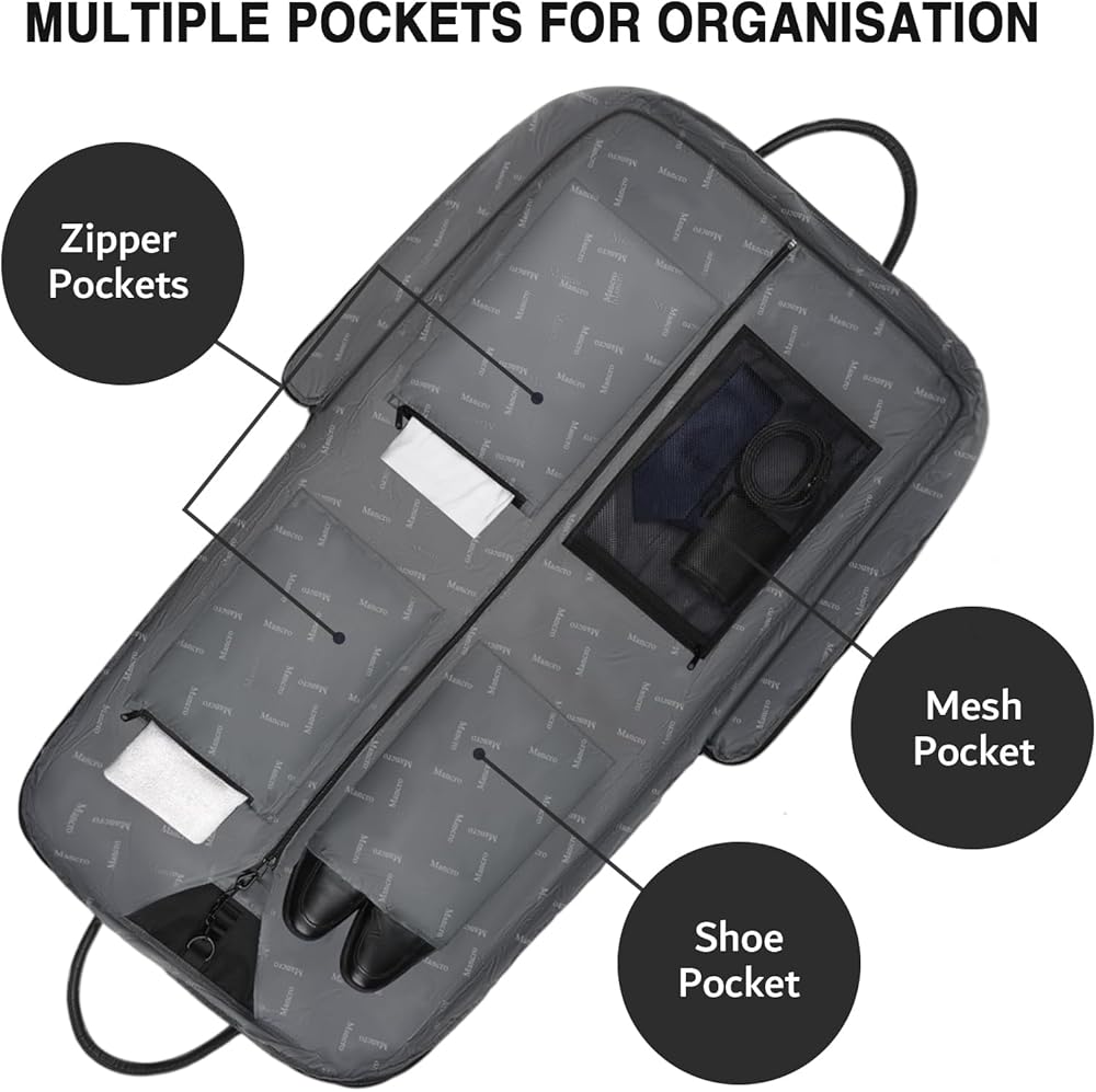 جيوب متعددة للتنظيم: حقيبة الملابس للرجال مدمجة بجيبين كبيرين بسحّاب، وجيب شبكي وجيب للأحذية لتخزين الأحذية والربطات والجوارب والأحزمة وما إلى ذلك؛ تم تصميم الحجرة الأمامية الخارجية بجهاز كمبيوتر محمول مقاس 15.6 بوصة حجرة وفتحات متعددة للوصول السريع إلى أجهزتك الإلكترونية أو الأقلام. يمكن لجيبين بسحاب خارج حقيبة البدلة الرجالية تخزين المستندات أو الكتب أو البطاقات.