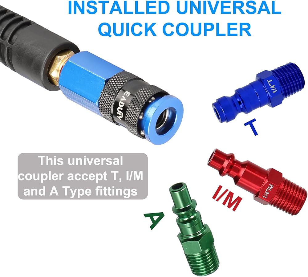 • ➤ سهل الاستخدام: تم تركيب خرطوم ضاغط الهواء EADURY هذا لتوصيل وصلة التوصيل السريع العالمية التي تناسب مقابس I/M وT وARO الثلاثة. تصميم من ست كرات، قفل الصلصال بشكل آمن يضمن عدم تسرب الاتصال.