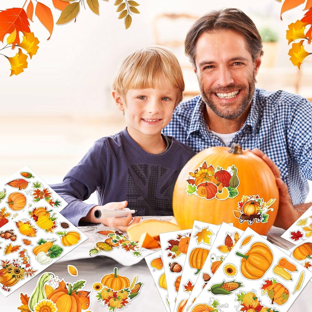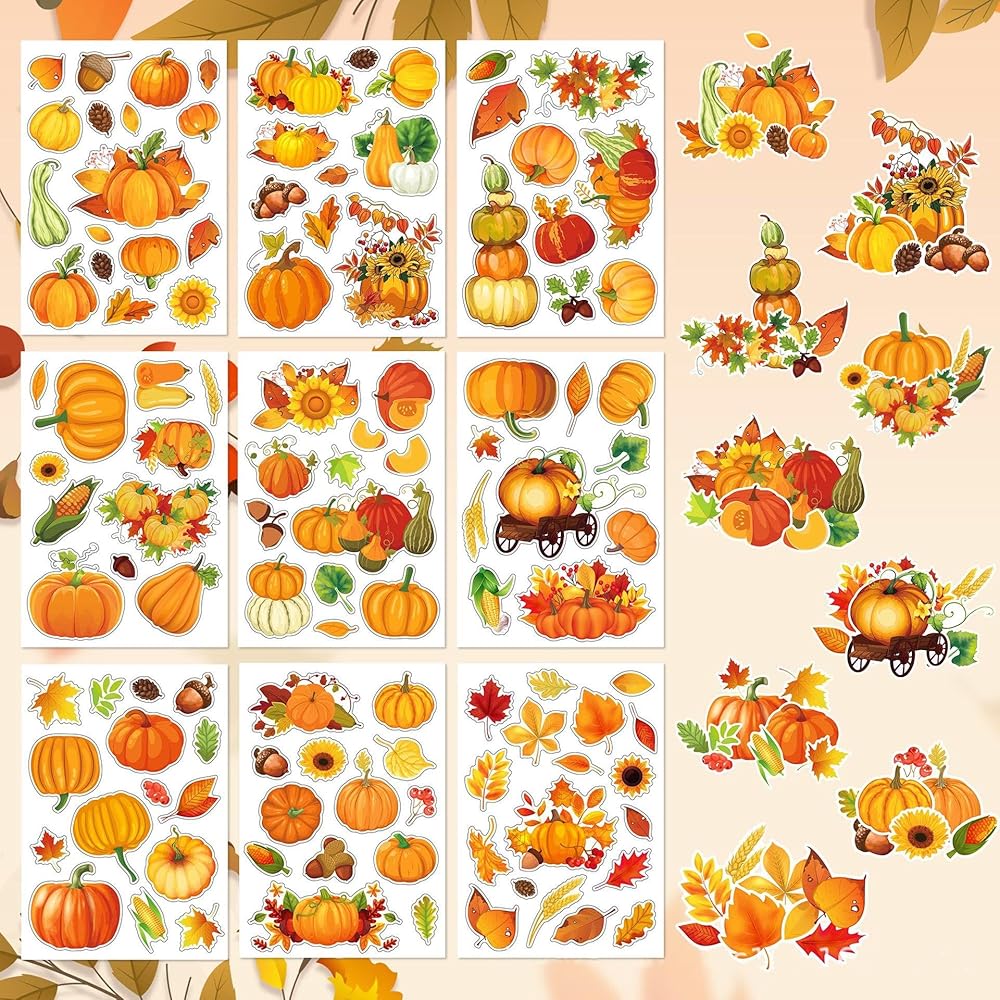 🍁PACKAGE CONTENT: You will receive 9 Thanksgiving Pumpkin Maple Leaf Stickers, fall stickers are full of classic elements of fall and Thanksgiving, including pumpkins, maple leaves, pine cones and so on, which is enough to satisfy your various needs for crafts.