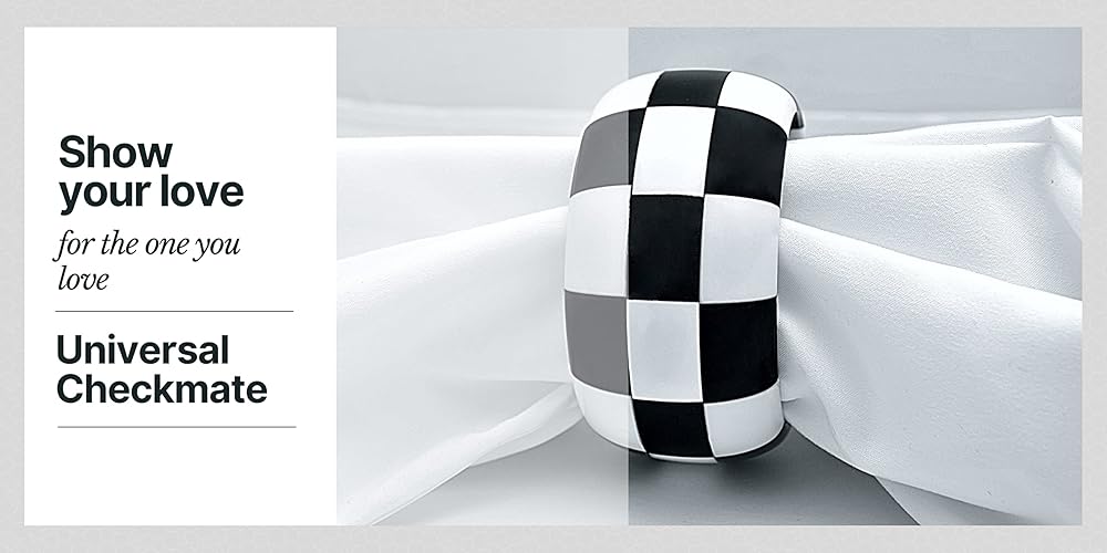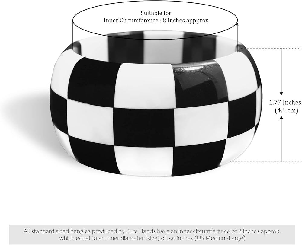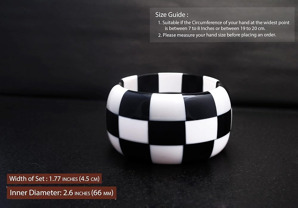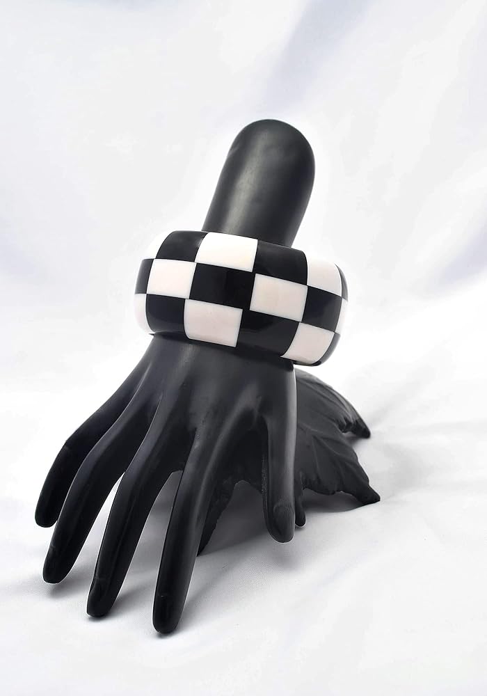 【💎 التصميم】: Universal Checkmate من مجموعة Hues of Checkmate عبارة عن سوار جريء مصنوع يدويًا من الراتنج مستوحى من تصميم لوحة الشطرنج تم تحقيقه باستخدام فن النجارة، في مزيج ألوان عالمي من الكافيار الأسود والأبيض. إنها مصقولة للحصول على لمسة نهائية ناعمة من الساتان.