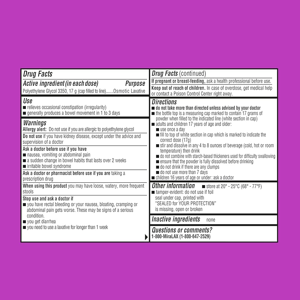 MiraLAX is a polyethylene glycol (PEG 3350) laxative powder made for providing gentle constipation relief. Unlike some laxatives which stimulate the nerves, MiraLAX is a non stimulant osmotic laxative, working naturally with the water in your body to hydrate, soften, and ease stool through the colon gently. Since going on the market in 2007, MiraLAX has been the #1 Physician Recommended OTC brand of laxative. It relieves occasional constipation without causing harsh side effects like cramping, bloating, sudden urgency, and gas. MiraLAX is a gentle laxative designed to relieve occasional constipation and presents no risk of product dependence. Constipation can be caused by lifestyle factors such as stress, diet, travel, medications, and lack of exercise. It can be defined by fewer than normal bowel movements, difficulty passing stool and abdominal bloating. To use, fill bottle cap to the indicated line (white section in cap) and pour into 4 to 8 ounces of hot or cold beverage including but not limited to coffee, tea, juice, milk and more. Mix until the powder is fully dissolved, then drink. Plus, MiraLAX has no added taste or grit. MiraLAX generally produces a bowel movement in 1-3 days.