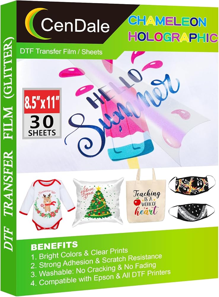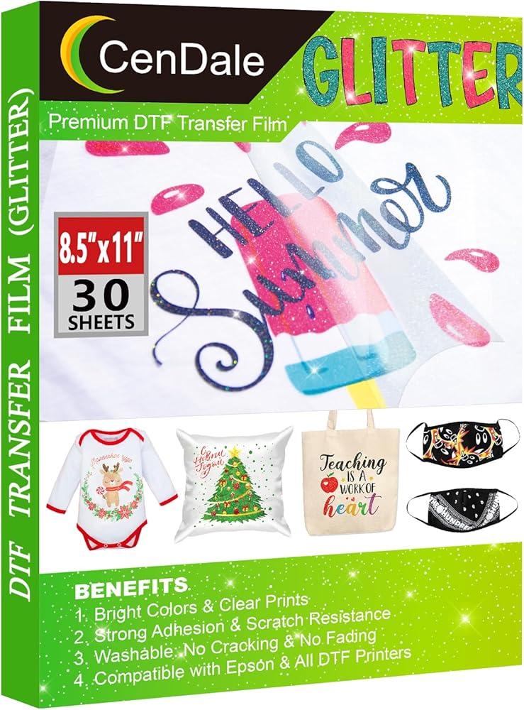 ✨ 【جودة ومتانة استثنائية】تعمل عملية الطلاء المكونة من 5 طبقات على تعزيز امتصاص الحبر للحصول على مطبوعات أكثر امتلاءً ونابضة بالحياة، مما يوفر عمليات نقل رائعة وغنية بالألوان. تم تجهيز الجانب العكسي اللامع بطبقة مضادة للانزلاق، مما يضمن تغذية الطابعة بسلاسة. استمتع بقابلية الغسل المتميزة ومقاومة التمدد. ارفع تصميماتك مع فيلم CenDale's Glitter DTF، مما يضيف تألقًا فريدًا يجعل ملابسك تتألق مع بريق آسر وملفت للنظر.