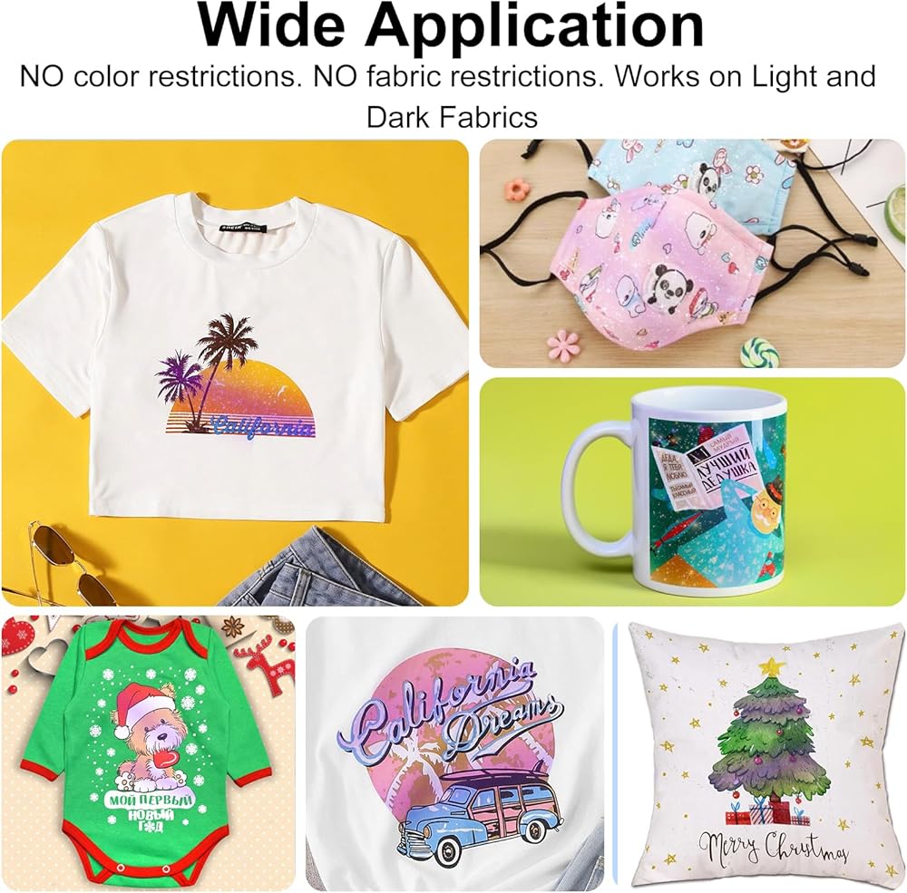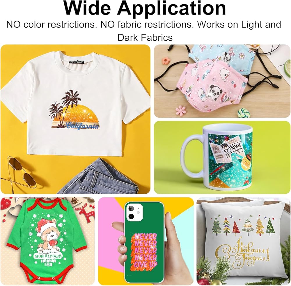 ✨【توافق واسع】تعد الطباعة بالنقل المباشر تقنية ثورية جديدة وبأسعار معقولة ويمكن الوصول إليها بسهولة. لا توجد قيود على الألوان، ولا قيود على القماش. استمتع بحرية الطباعة على مجموعة واسعة من الأقمشة. يعمل فيلم النقل DTF الخاص بنا بسلاسة على كل من المنسوجات الفاتحة والداكنة، بما في ذلك القطن والبوليستر والمواد الاصطناعية والمخلوطة. ملحوظة: عند استخدام DTF sublimaiton hack، تكون الأقمشة البيضاء فقط هي المتوافقة بسبب نقص الحبر الأبيض.