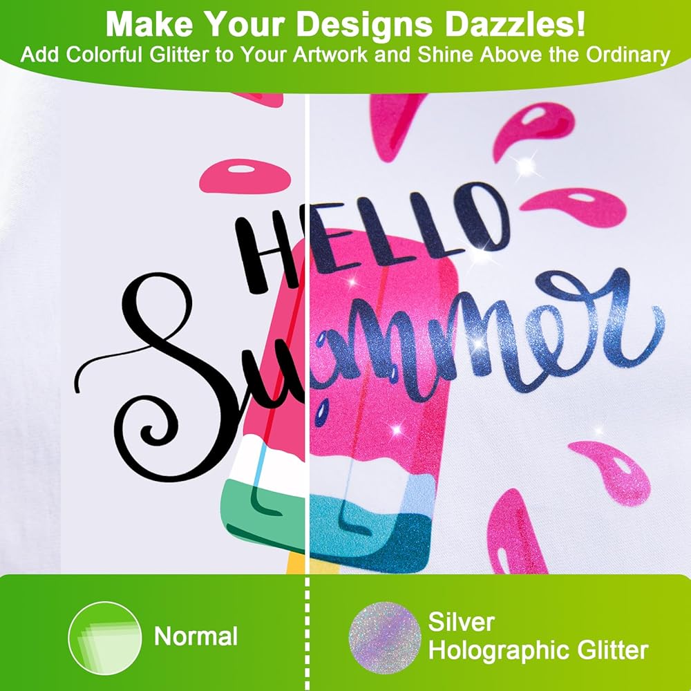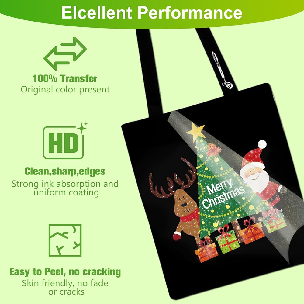 ✨ 【سهلة الاستخدام】تخطي خطوة المعالجة المسبقة - ما عليك سوى إنشاء الحجم المطلوب وطباعته وقصه بسهولة دون الحاجة إلى إزالة الأعشاب الضارة. يتيح لك فيلمنا الطباعة على القطن غير المعالج، والدنيم، والحرير، والبوليستر، والنايلون، والجينز، والجلود، والمخلوط، والليكرا، ومواد أخرى متنوعة بسهولة. يعمل الجانب المزين ببريق ملون بمثابة سطح الطباعة، مع عكس الصورة المطلوبة للطباعة. استمتع بالبساطة في كل خطوة من العملية.