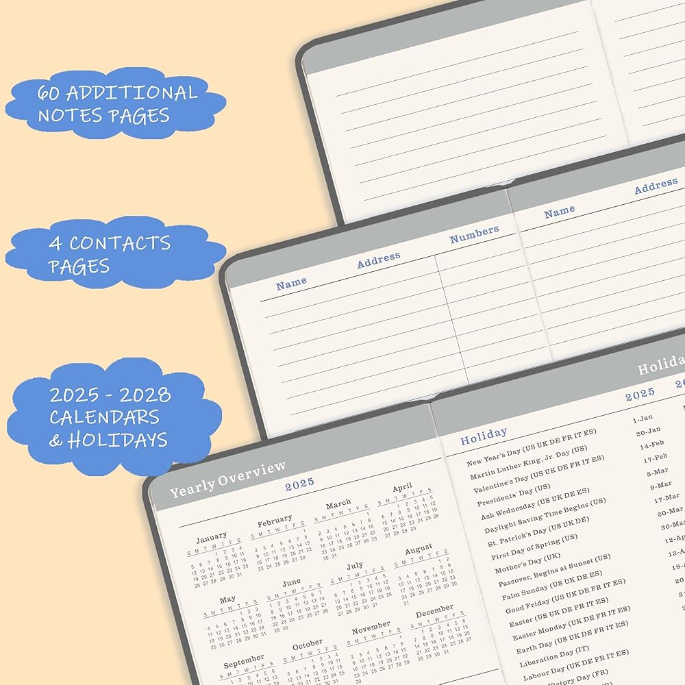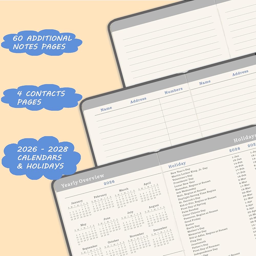 • 🍭 تصميم احترافي - ربط السلك المزدوج يسمح بغطاء قابل للطي 360 درجة. نظرة عامة سنوية 2024-2026/4 صفحات جهات اتصال مهمة/8 صفحات اتصال/4 صفحات كلمة المرور/معلومات شخصية/عطلات 2024-2026.