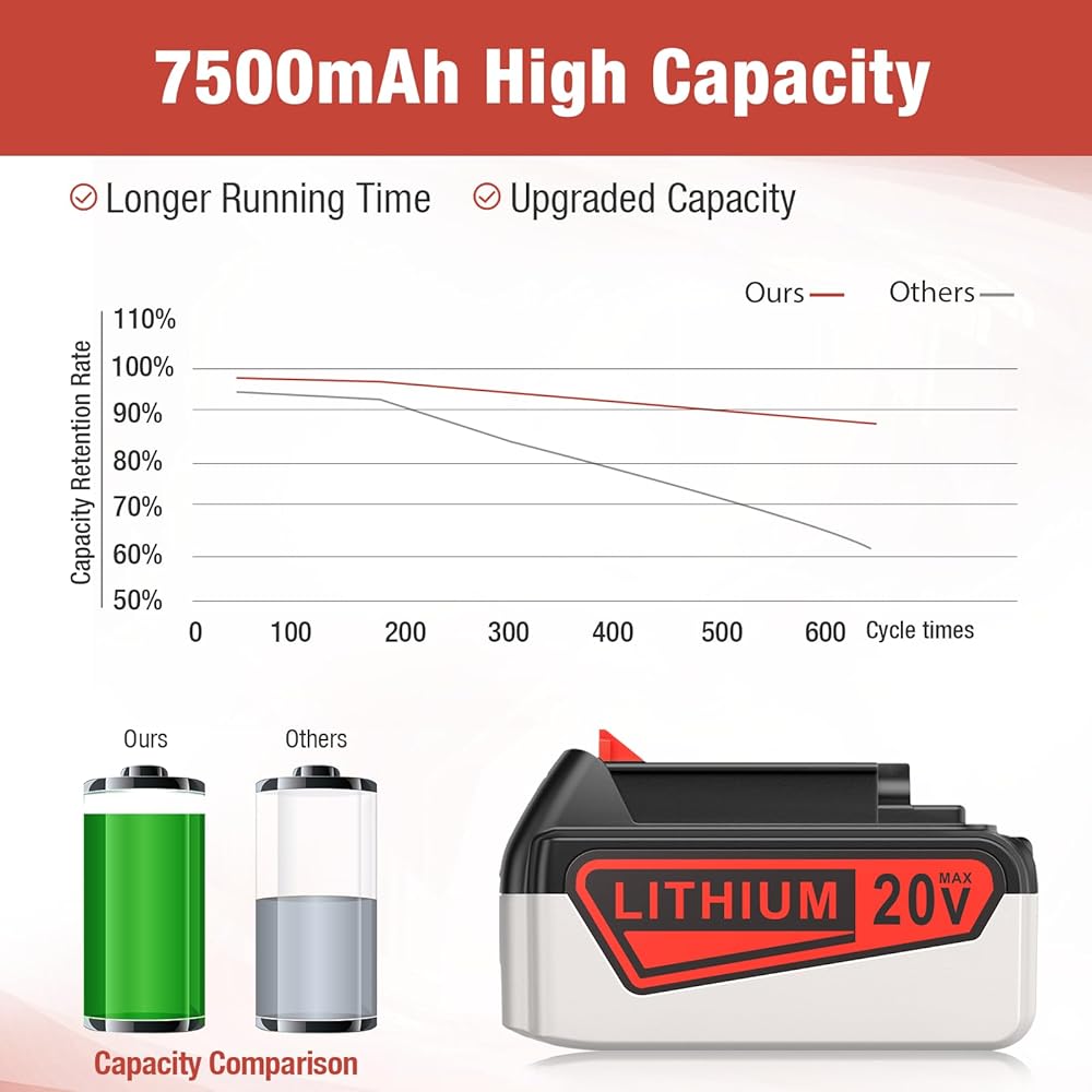 【مواصفات البطارية】نوع البطارية: ليثيوم أيون| الجهد: 20 فولت | السعة: 7500 مللي أمبير | بديل مطور لبطارية الليثيوم بلاك اند ديكر 20 فولت كحد أقصى، وقت تشغيل أطول من البطاريات الأخرى 6000 مللي أمبير في الساعة.