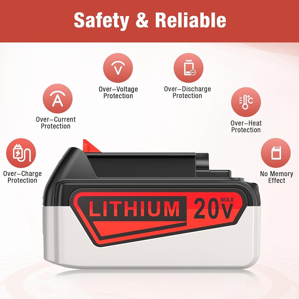 【حماية متعددة للسلامة】رقاقة حماية ذكية مع أنظمة حماية متعددة الشحن الزائد والتفريغ الزائد والتيار الزائد والجهد الزائد لضمان السلامة. ملحوظة: نظرًا لأن البطارية تتمتع بحماية السلامة من الحرارة الزائدة، تجنب إعادة الشحن فورًا بعد تفريغها بالكامل، يرجى تبريد بطارية lbxr20 لجهاز Black and Decker قبل الشحن.