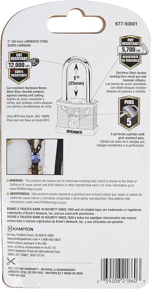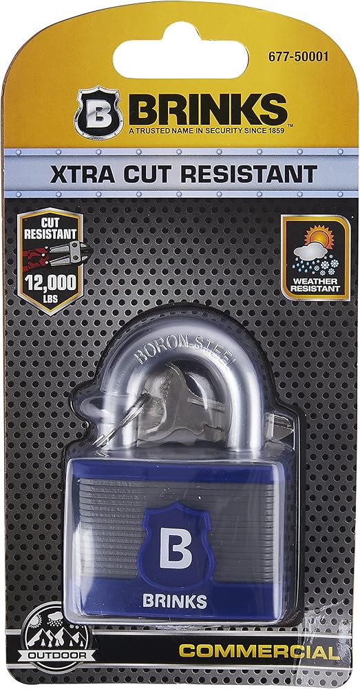This commercial grade padlock is 50mm in size, featuring 22 steel laminates in the lock body. This padlock features a consumer preferred powder coated finish designed to withstand all extreme weather conditions. This product also features a highly cut resistant 1-1/2 inch Boron shackle, stainless steel locking bars, 2 bumpers, and 5 pin pick-resistant cylinder. Lifetime warranty included. As a global leader in security-related products and services, the Brinks name is synonymous in top quality merchandise to keep you and your valuables safe. A credit to this tradition, Brinks' line of commercial grade locks are designed to exceed the most rigorous expectations of