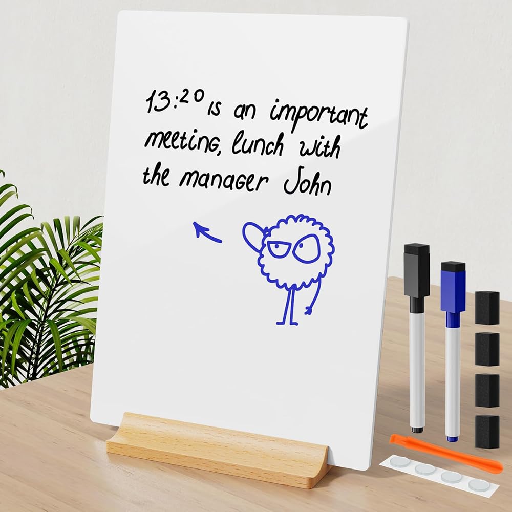 • Product Composition: Includes: 1 wooden base, 1 acrylic writing board, 2 whiteboard markers (black and blue), 4 replacement erasers, and 1 pry bar.