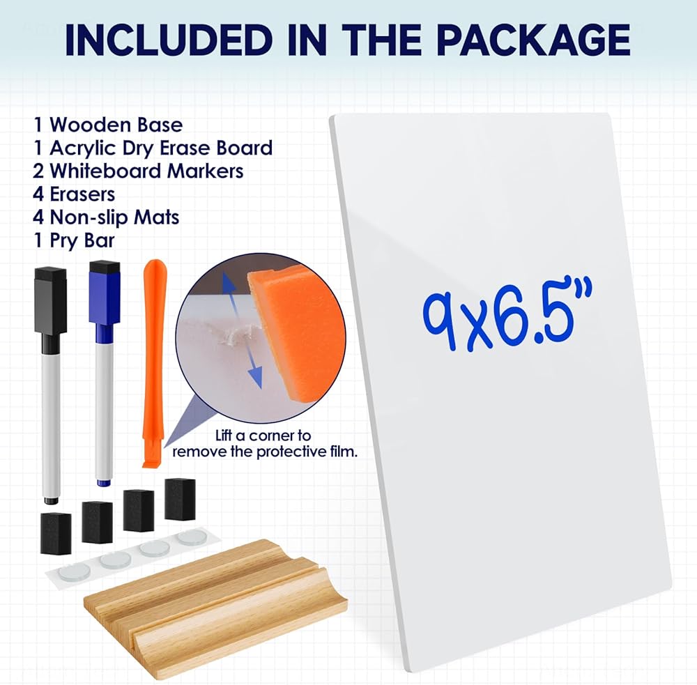 لوح مسح جاف من الأكريليك الأبيض بقاعدة خشبية، لوحة بيضاء بدون إطار للقيام بقائمة مع مجموعة أقلام تحديد وممحاة، لوحة مذكرة مدمجة ومحمولة مقاس 9 × 6.5 بوصة للمكتب والمنزل والمدرسة